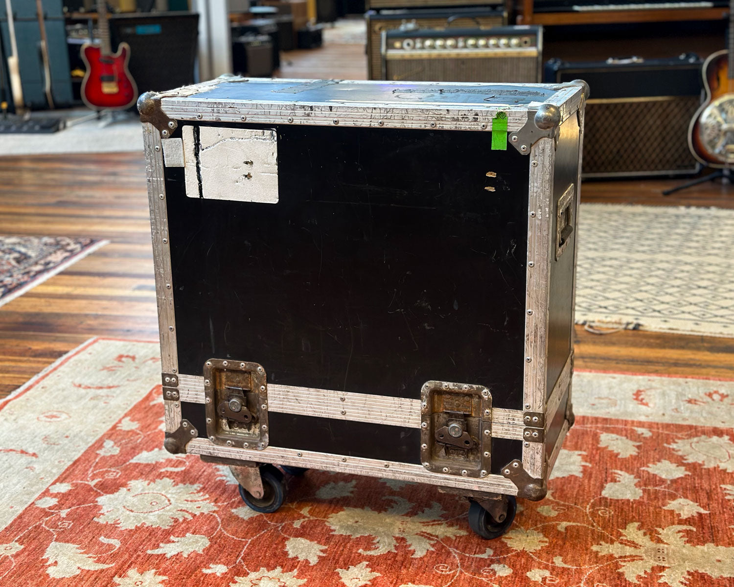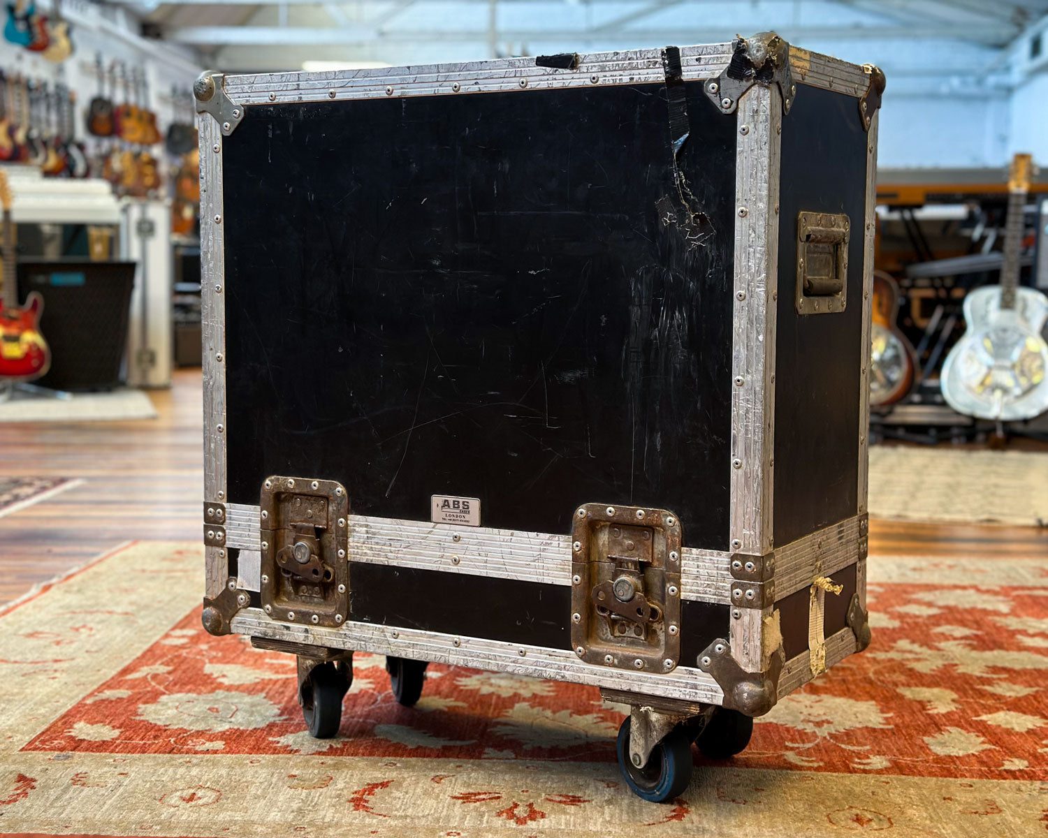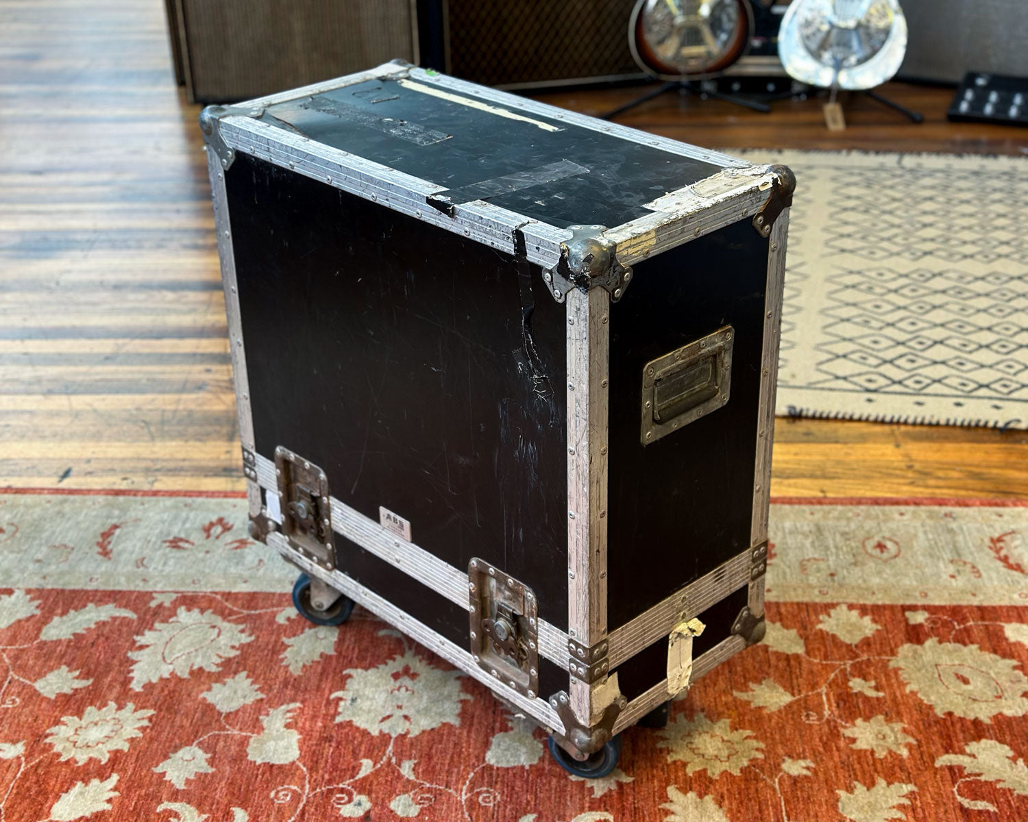Heavy duty tour case on casters suitable for Hot Rod DeVille amps (measuring approx 60 x 60 x 27 cm internally) or similar size combos, measuring about 85 x 80 x 40cm externally. Weighs approx. 26 kg.