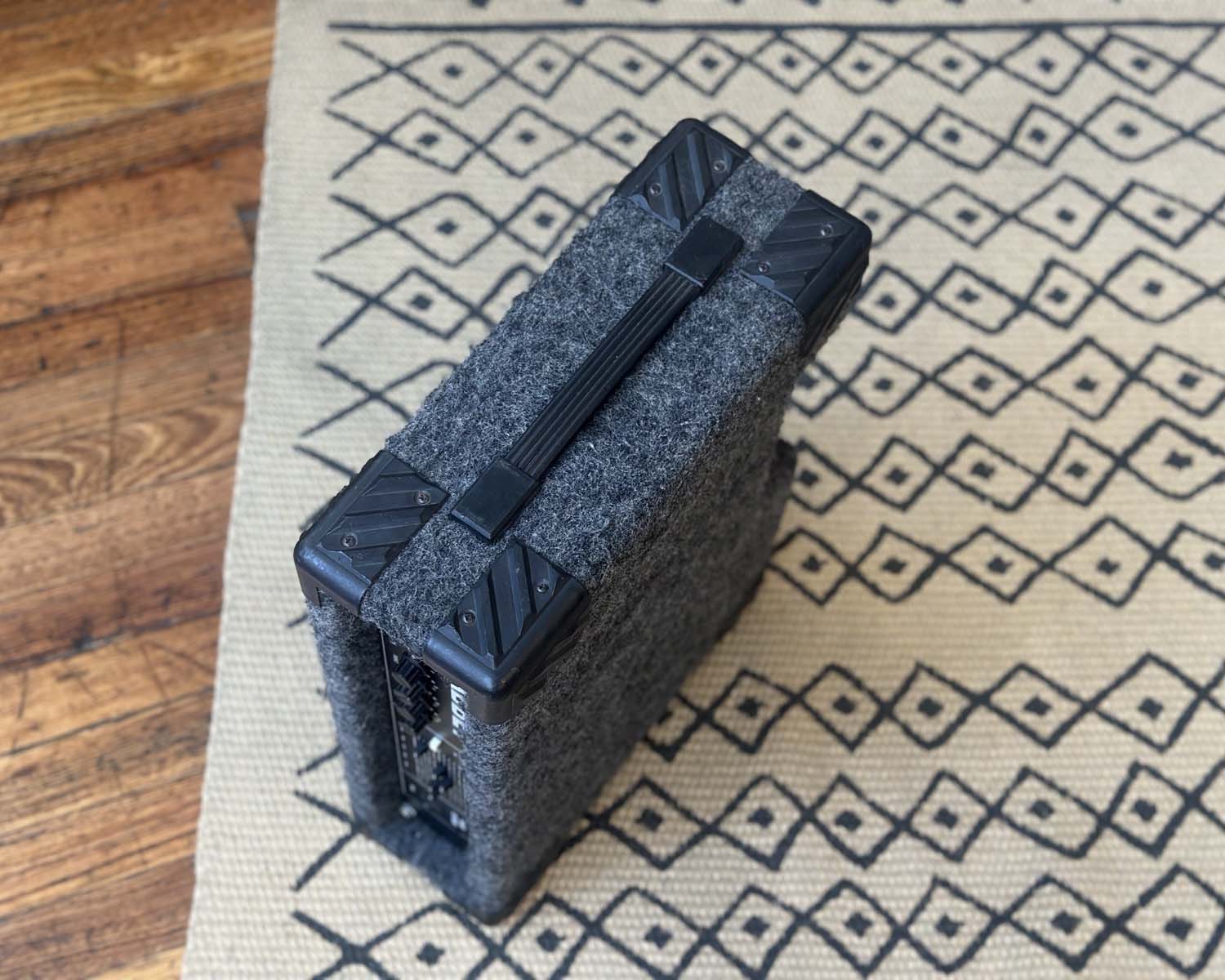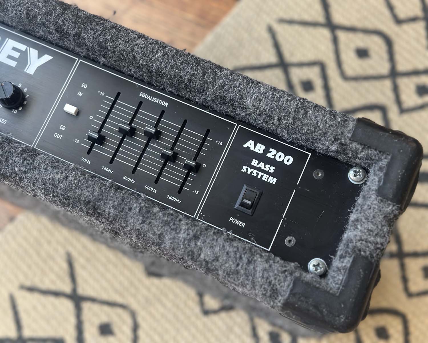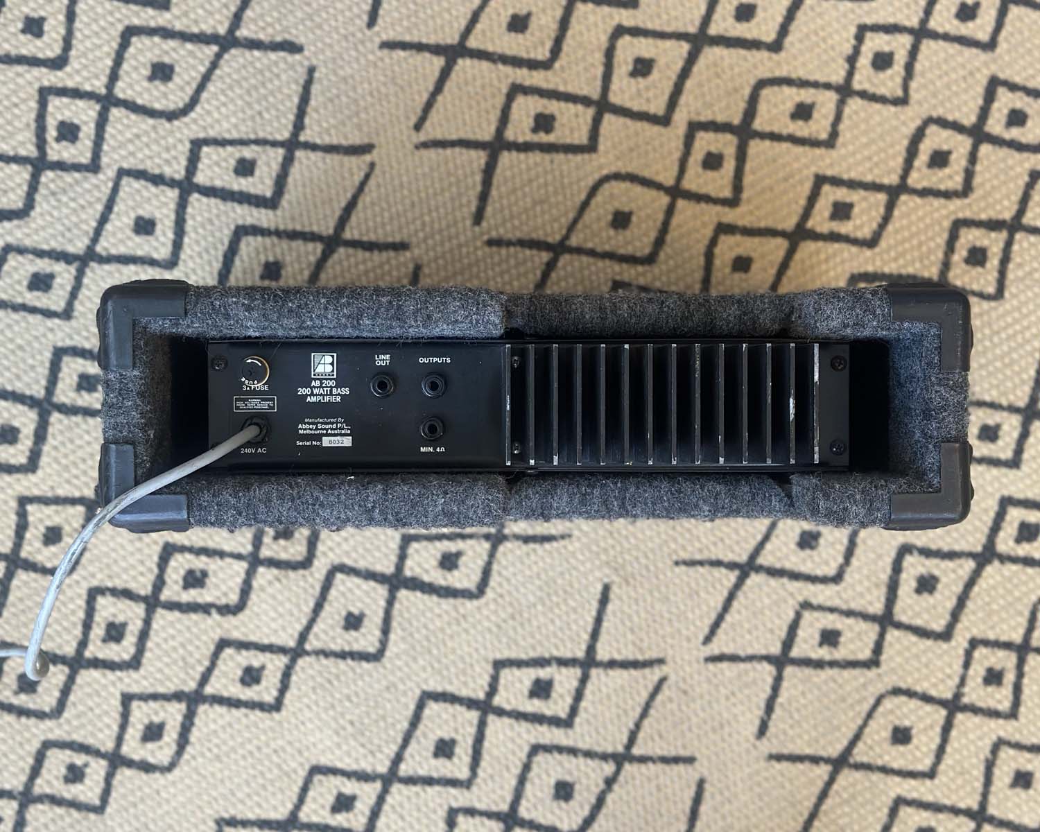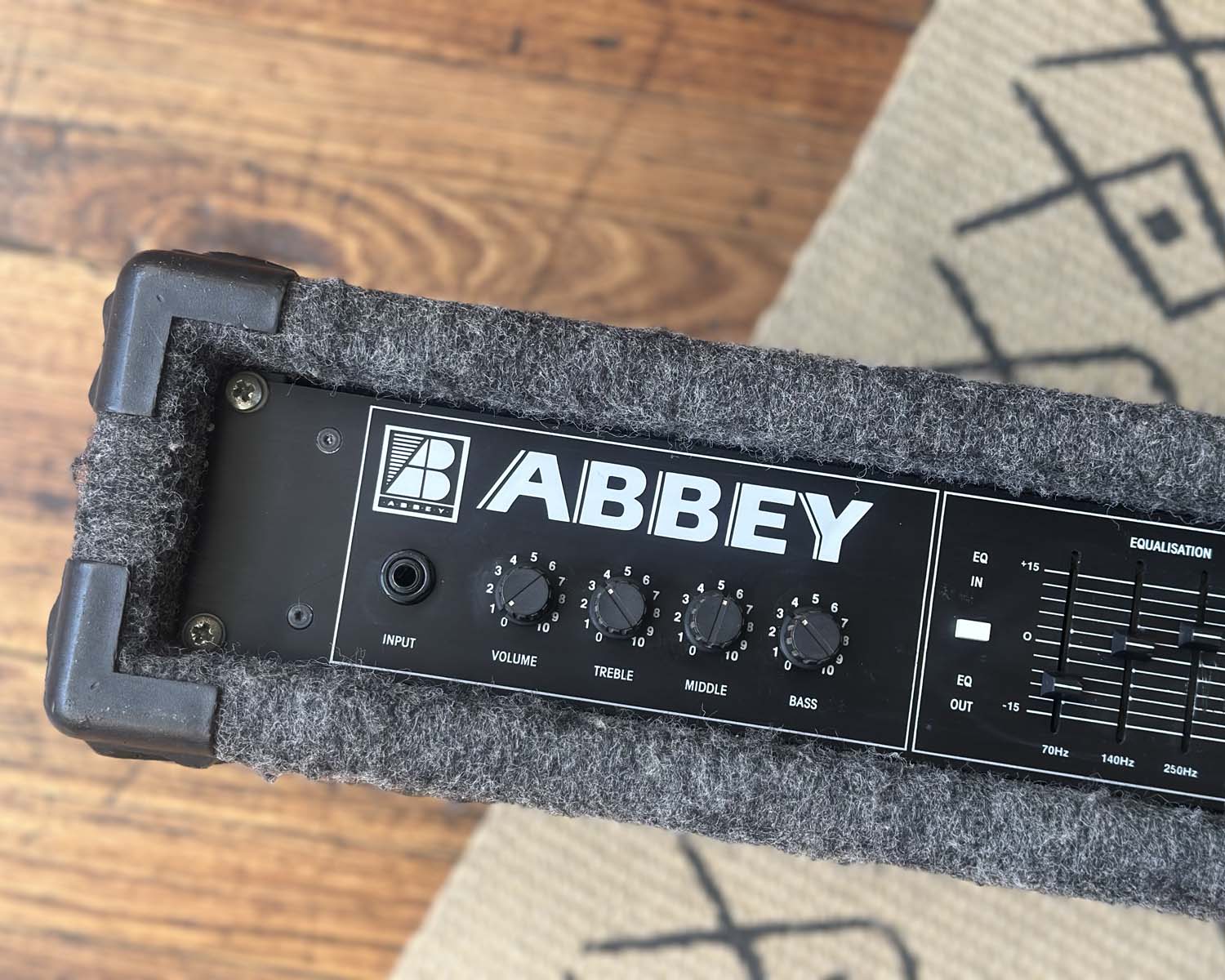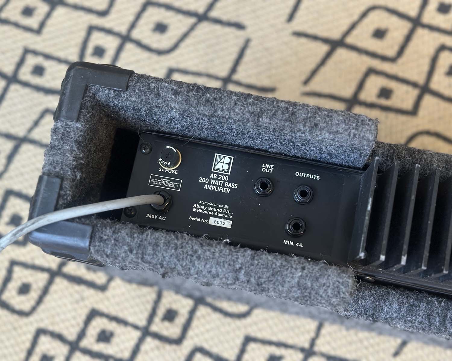 Vintage Abbey Sound 200W bass head, rated at 4Ω minimum. The control panel offers standard treble, mid and bass control, as well as EQ frequency control between 70Hz, 140Hz, 250Hz, 900Hz, and 1800Hz. Made in Melbourne, Australia.