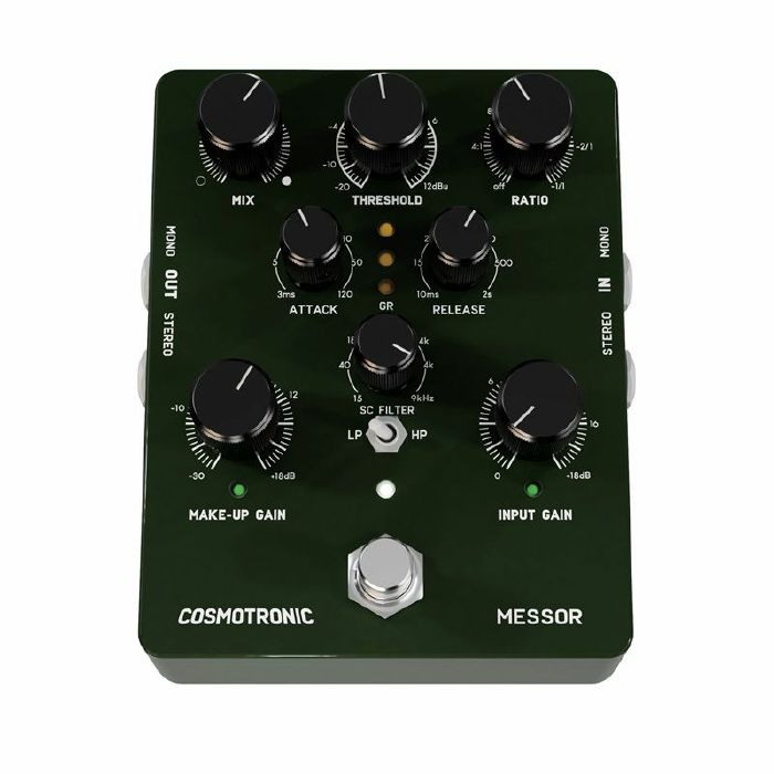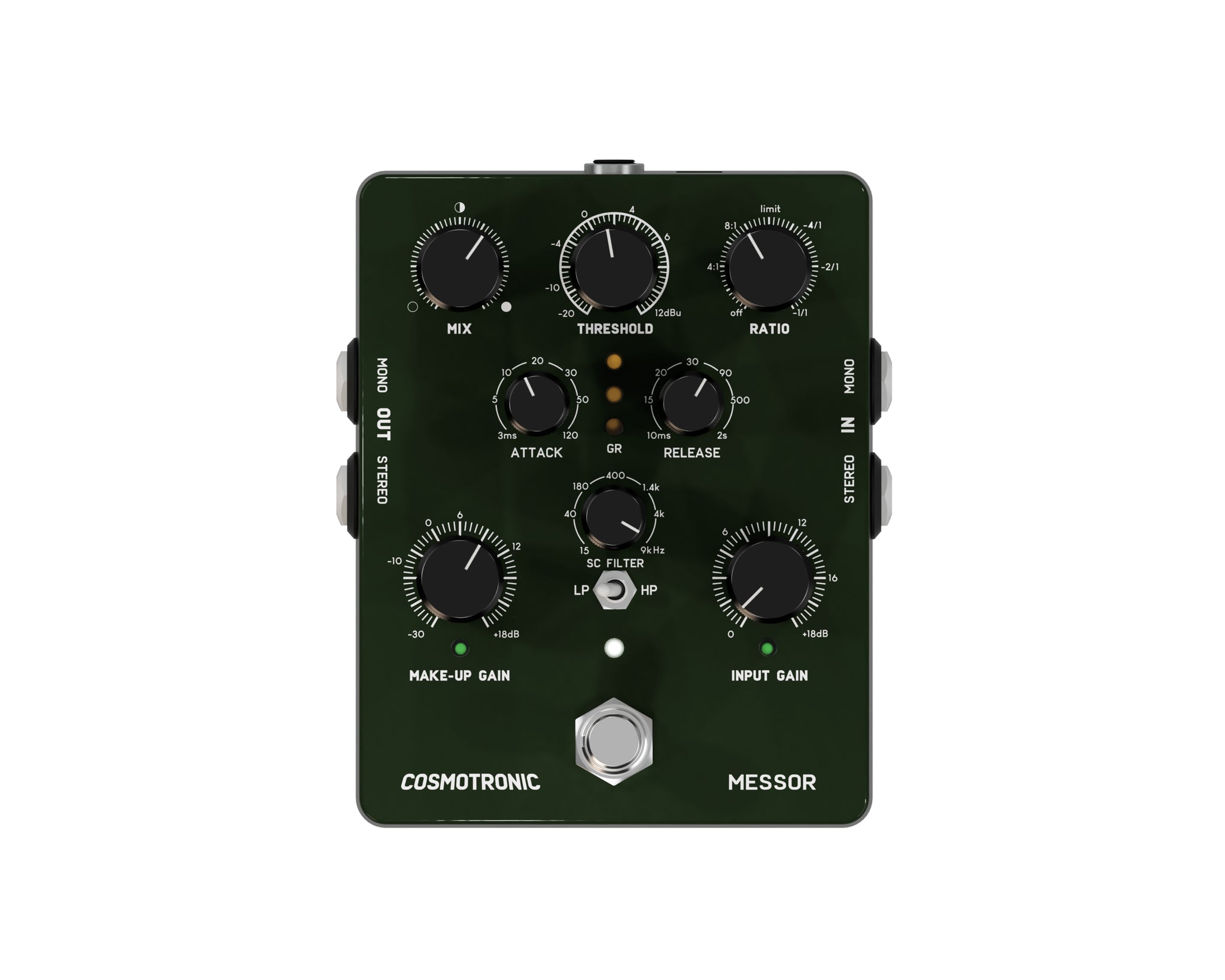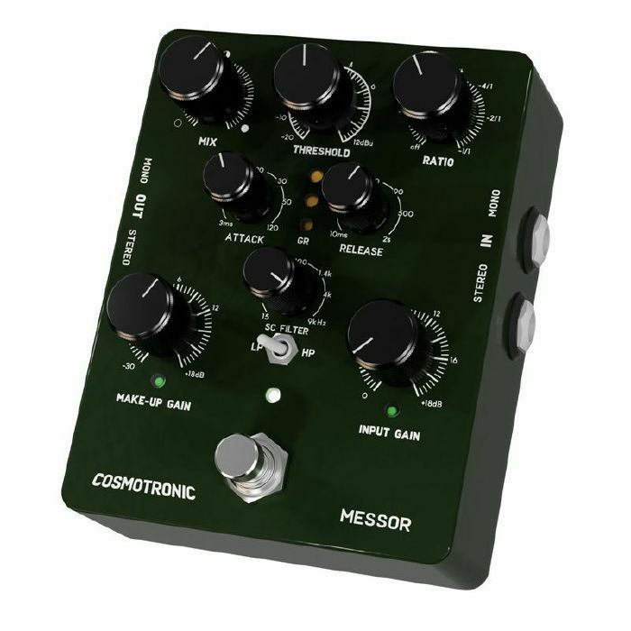 • Stereo analog compressor pedal derived from Cosmotronic's powerful modular compressor