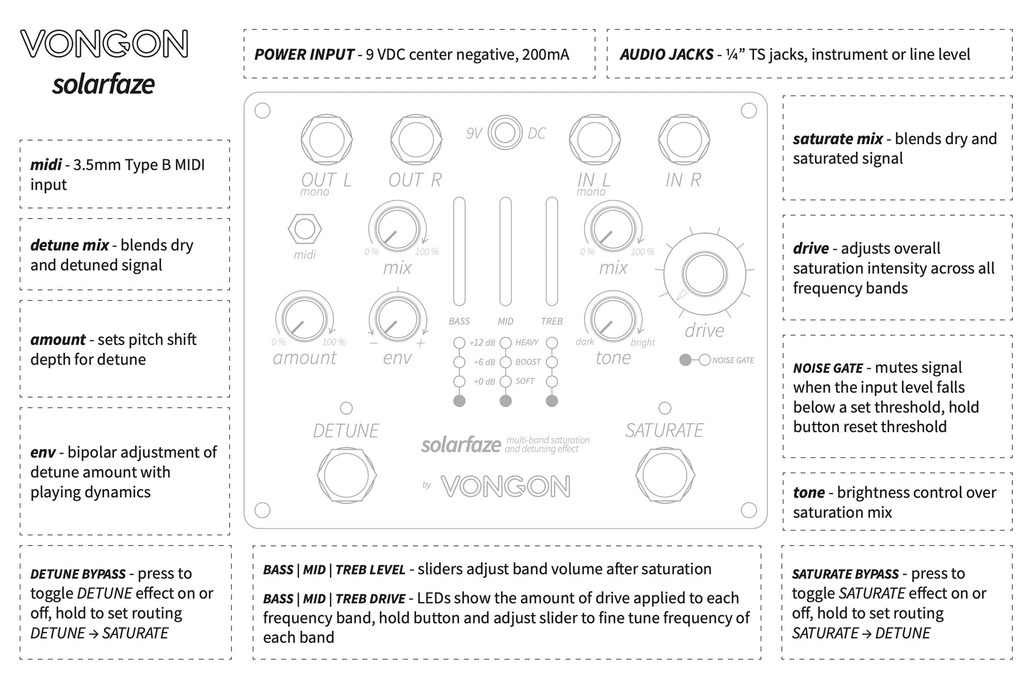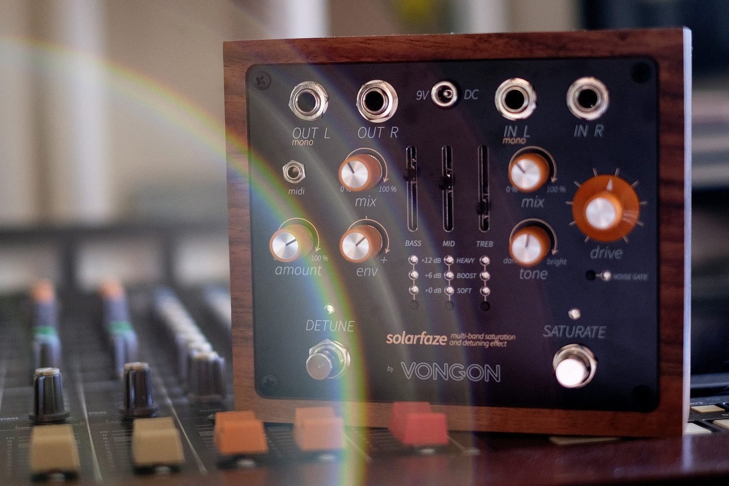 Solarfaze is a stereo audio processor that combines multi-band saturation with an envelope-controlled detune chorus, creating warmth, shimmer, and stereo dimension.
