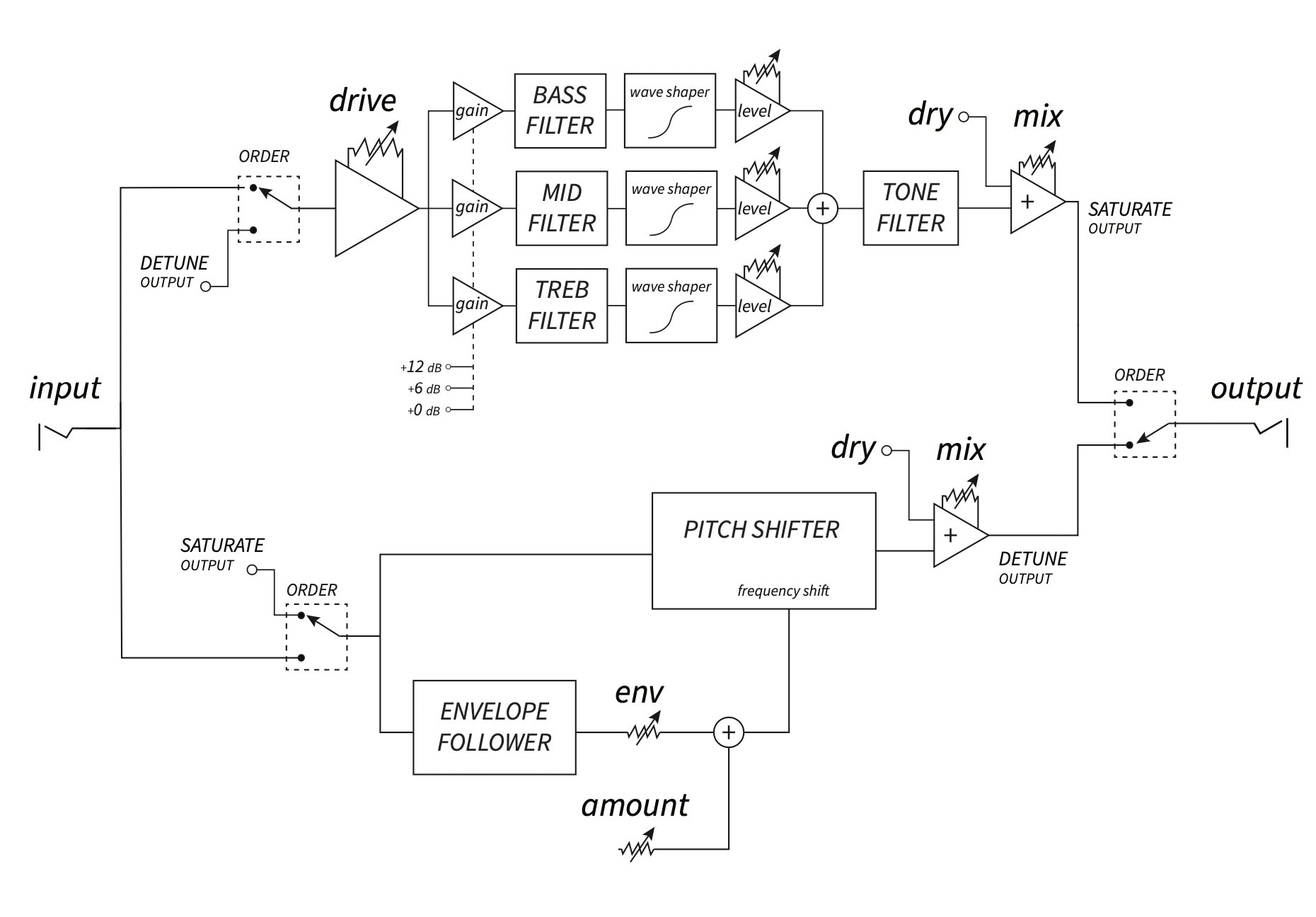 - Flexible effect routing: SATURATE → DETUNE or DETUNE → SATURATE