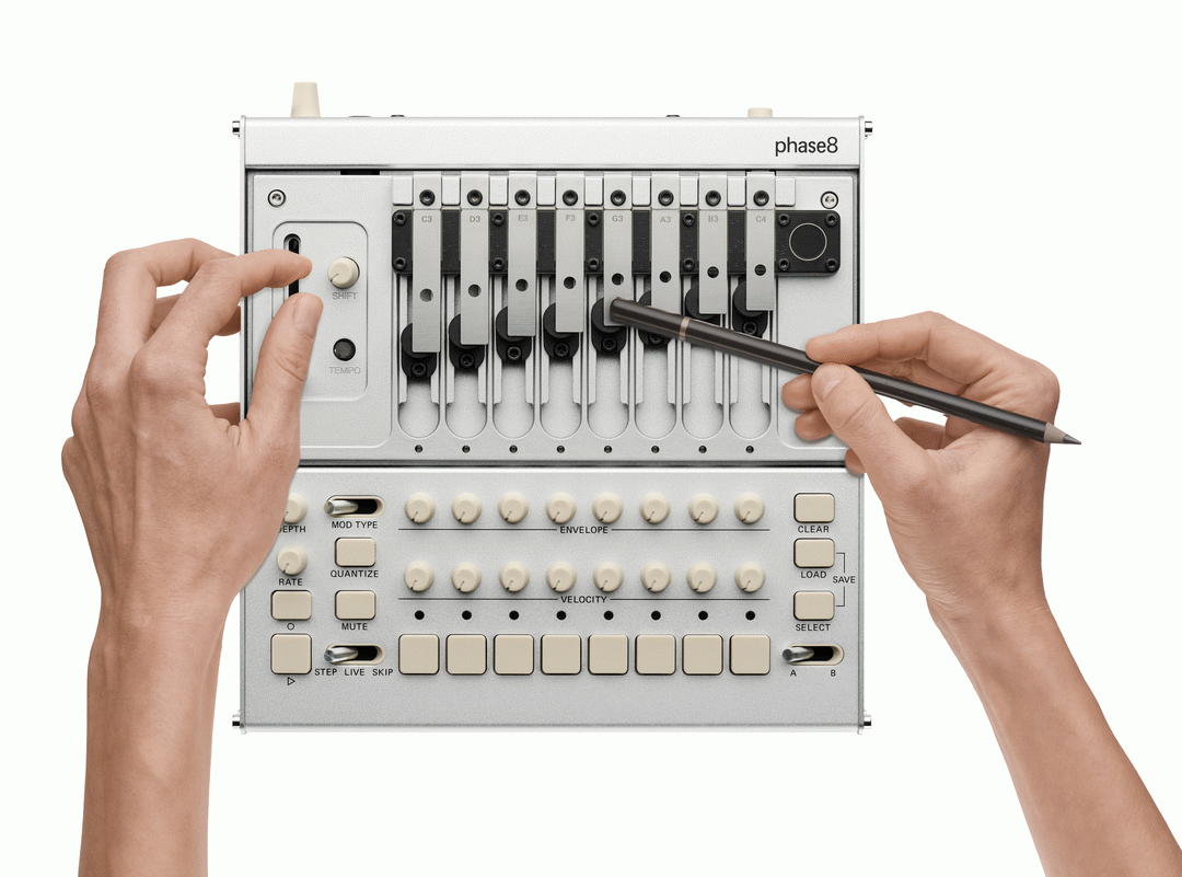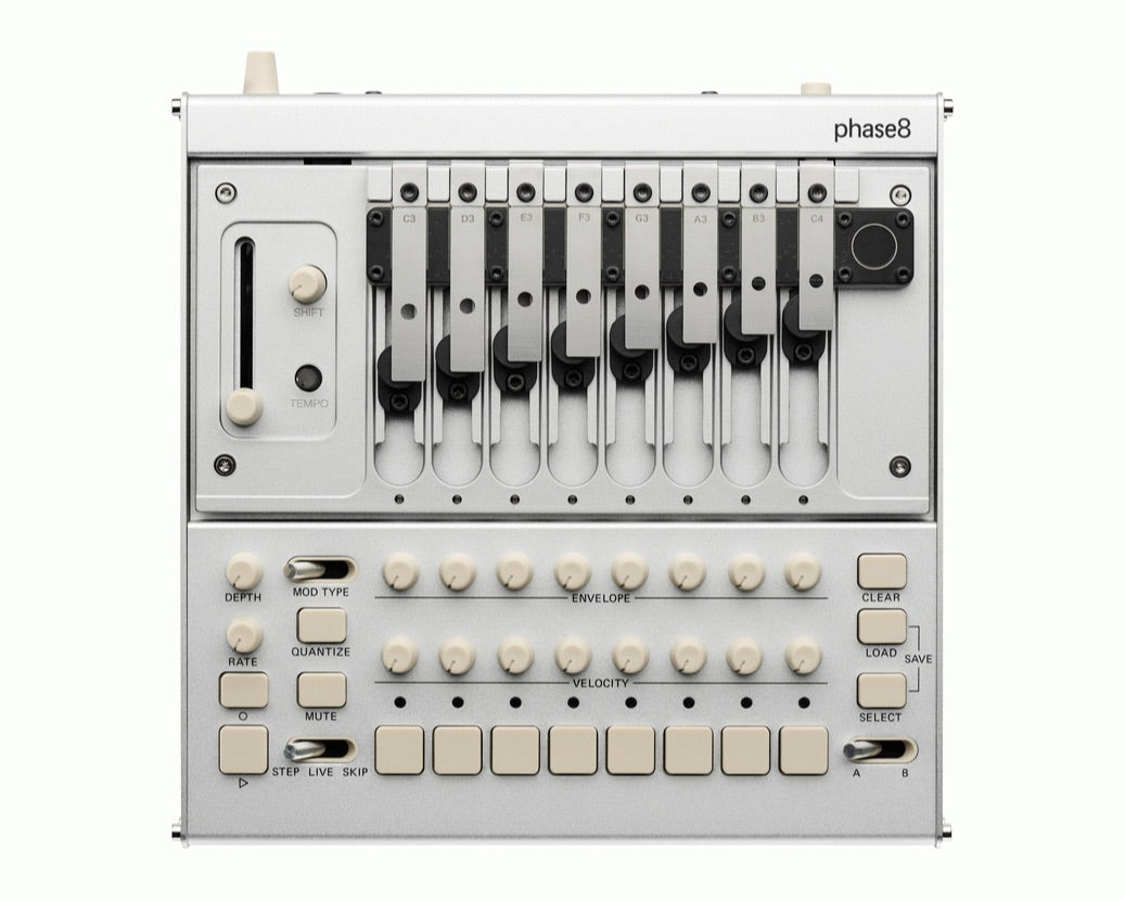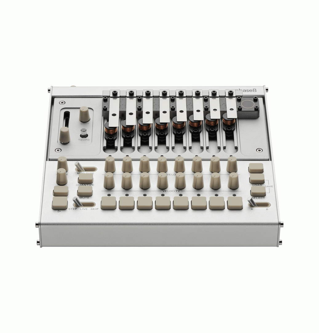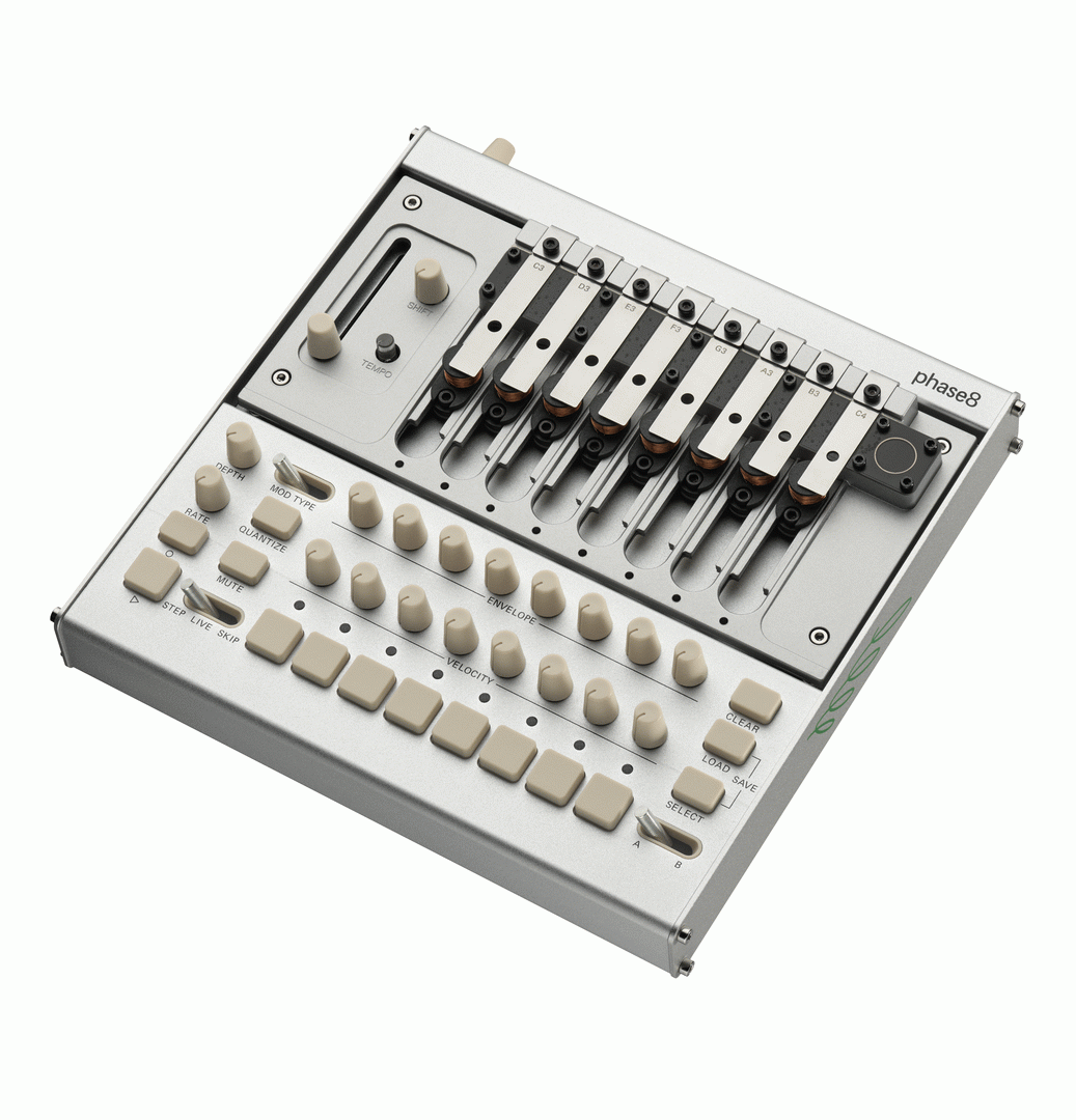 Eight of the included 13 chromatically tuned, swappable resonators can be installed at once, allowing everything from sharp percussive hits to sustained tonal textures. A polymetric sequencer supports step programming and free live recording, with per-voice step skipping and memory storage. External control is available via MIDI, USB-MIDI, and CV, enabling phase8 to both control and be controlled by other instruments.
