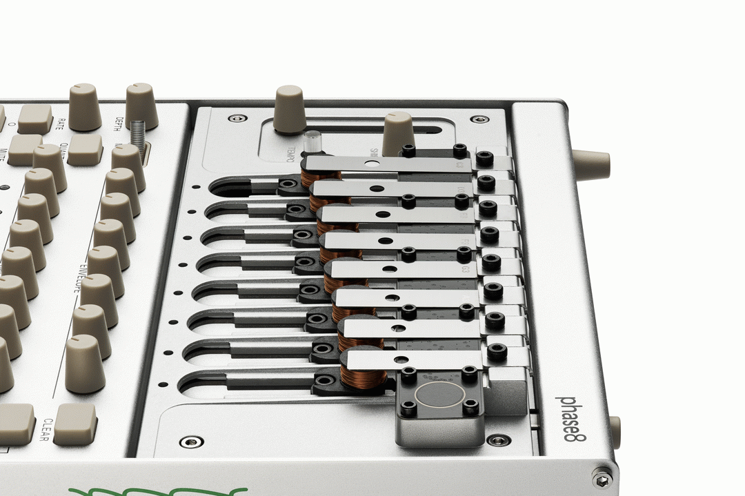Phase8 is an eight-voice acoustic synthesizer that blends physically resonating sound sources with detailed electronic control. Built around KORG’s Acoustic Synthesis technology, it generates sound using real vibrating steel resonators, shaped with envelopes, sequencing, analogue wavefolding, and pitch-dependent modulation for a deeply organic and responsive feel.