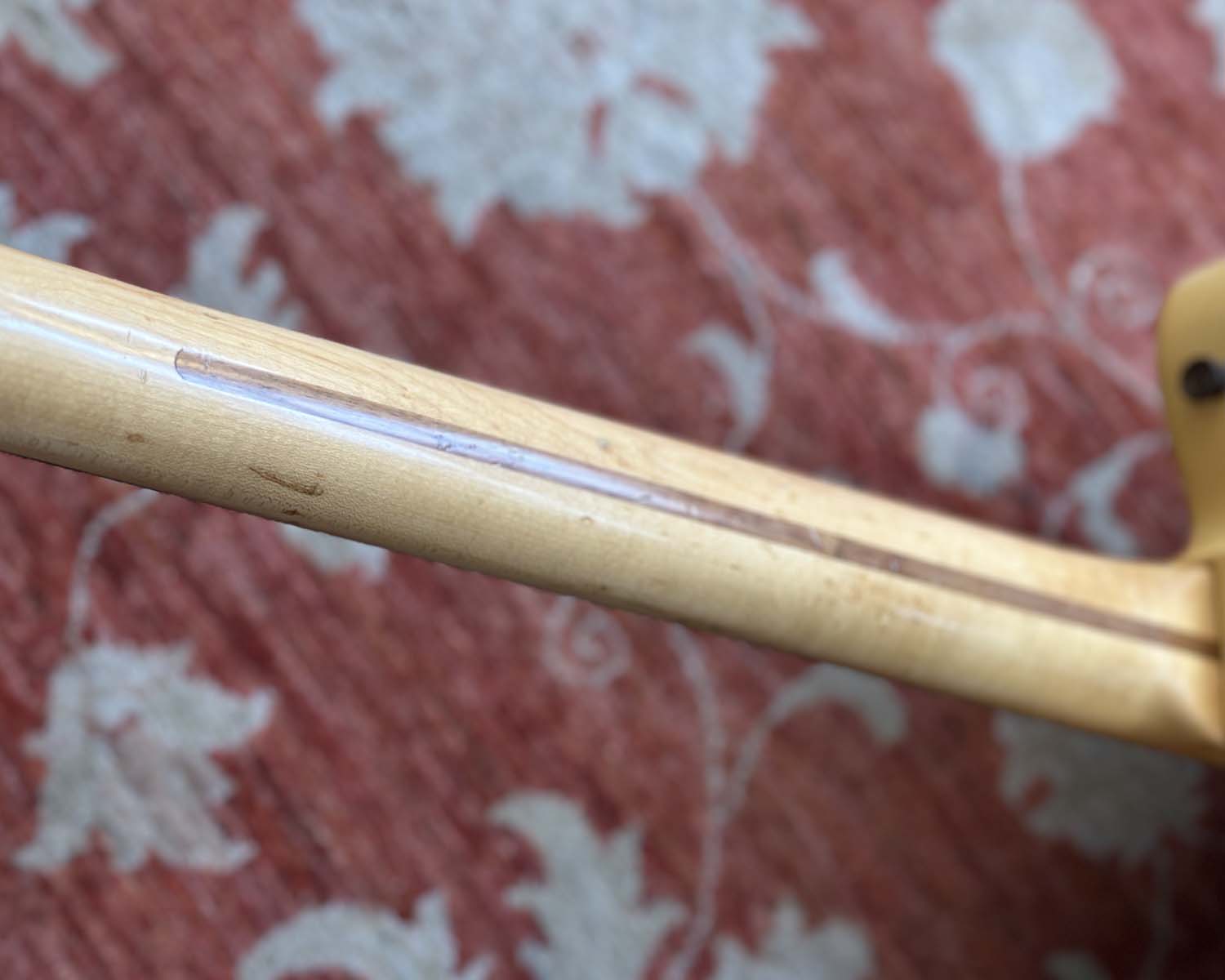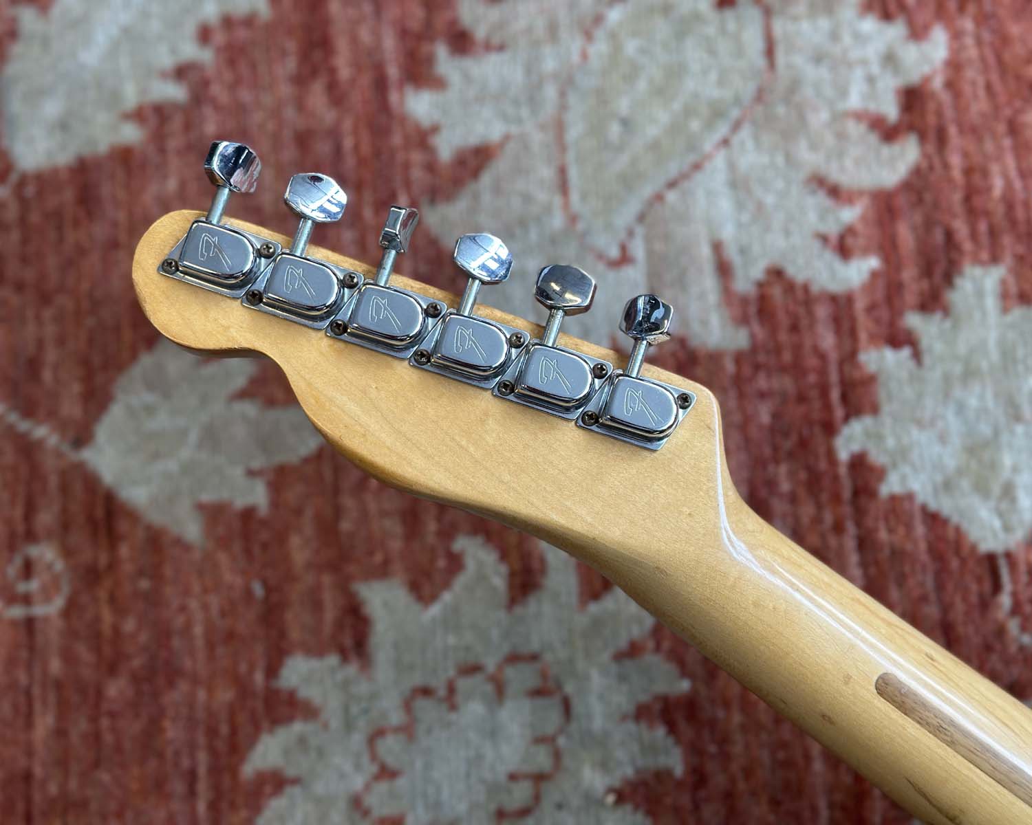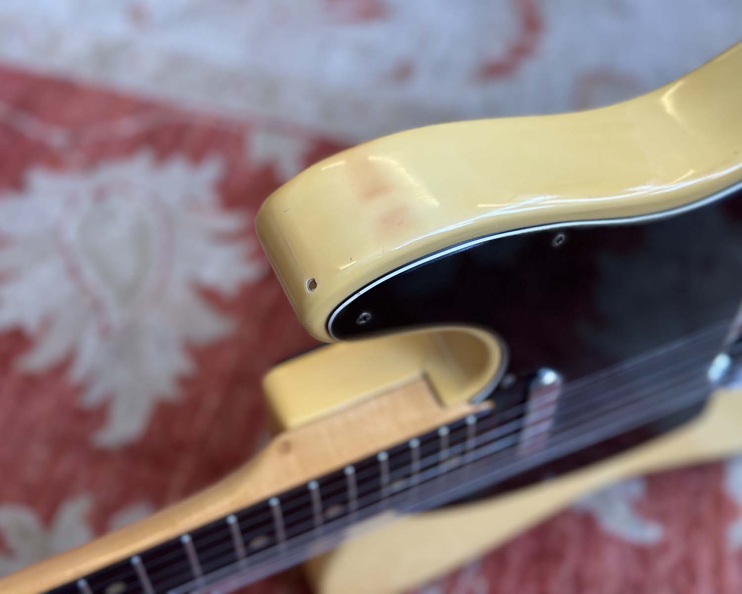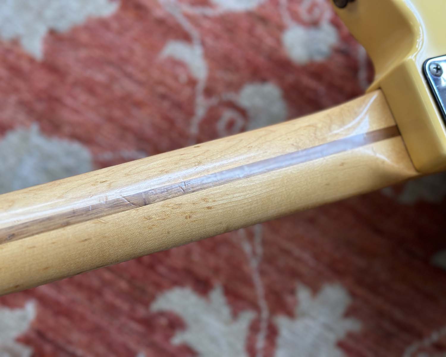 '78 neck, '79 body and pots. The original Olympic White has yellowed with age to an almost Butterscotch Blonde. Saddles non-original. Nut has been replaced with non-bleached bone nut and has has a re-fret. Includes Fender USA hard case and original saddles. Switch cap also most likely replaced. Burns and scuffs pictured.