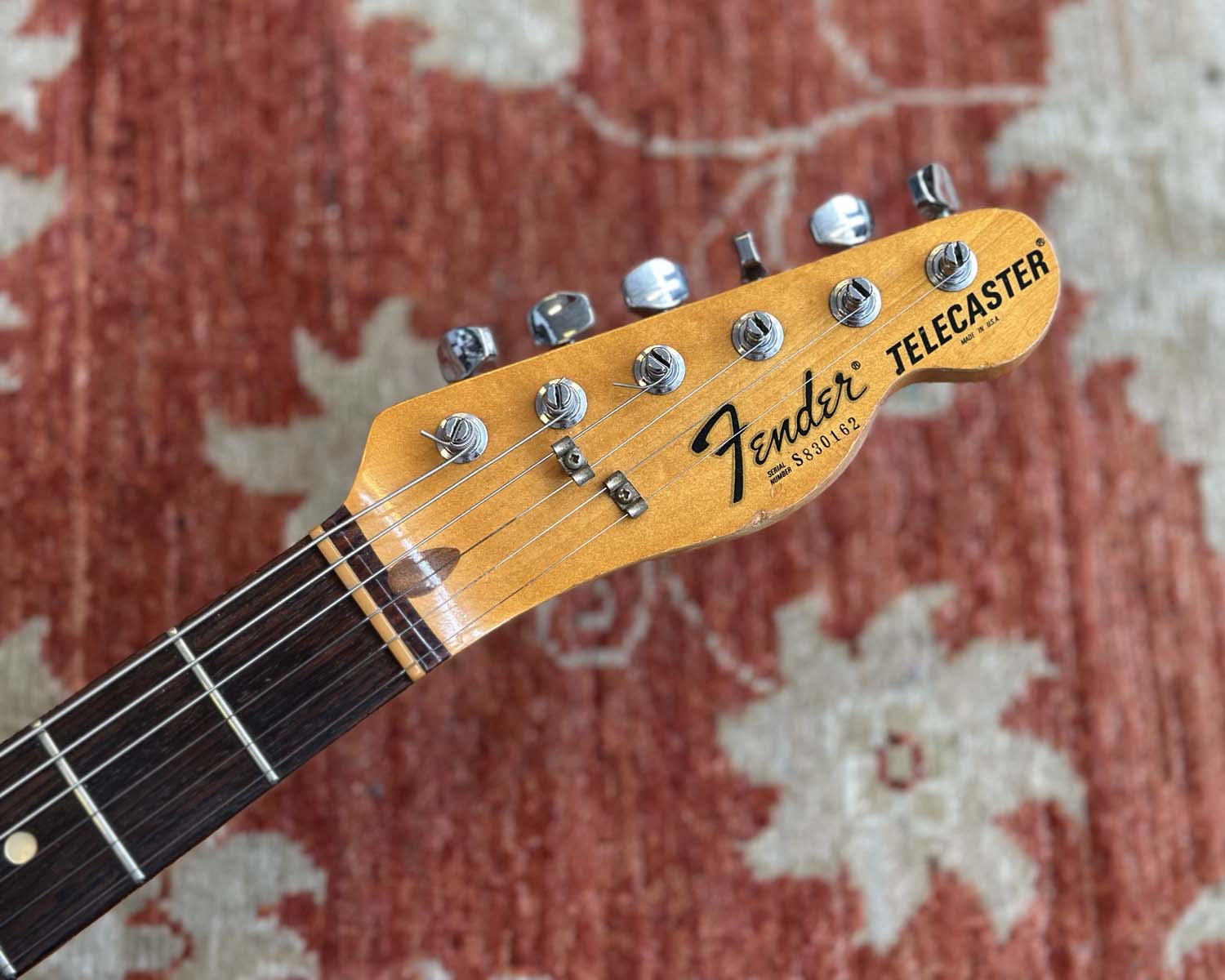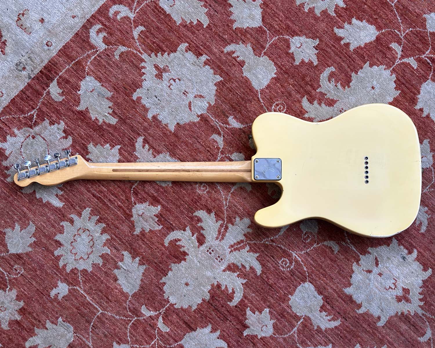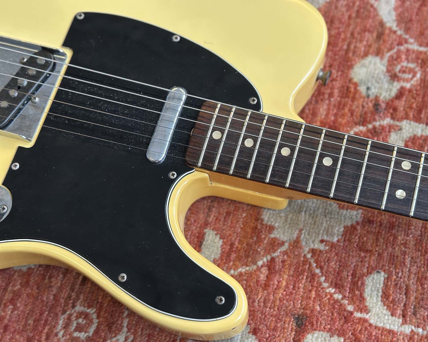 Beautiful 1979 Fender Telecaster in Olympic White, now yellowed with age and looking like a true vintage gem. Sporting an ash body with a black 3 ply pickguard, maple neck with a deep C neck profile and 4 bolt heel, a beautiful cut of dark rosewood slab for the fingerboard with 21 medium jumbo frets and white pearloid inlays. The standard array of controls command two classic Tele single coil pickups, giving you tones from twang through rock all the way to smooth clean jazz. Hardware includes the Tele ashtray bridge with 3 upgraded barrel saddles and original '70s 'F' style tuners. Guitars weighs roughly 4.5 kgs.