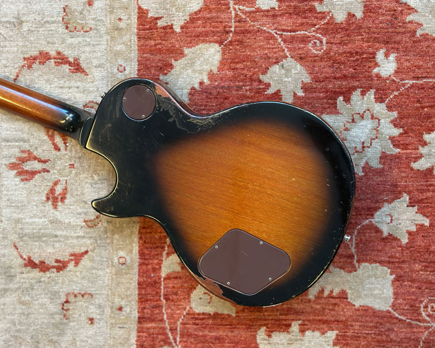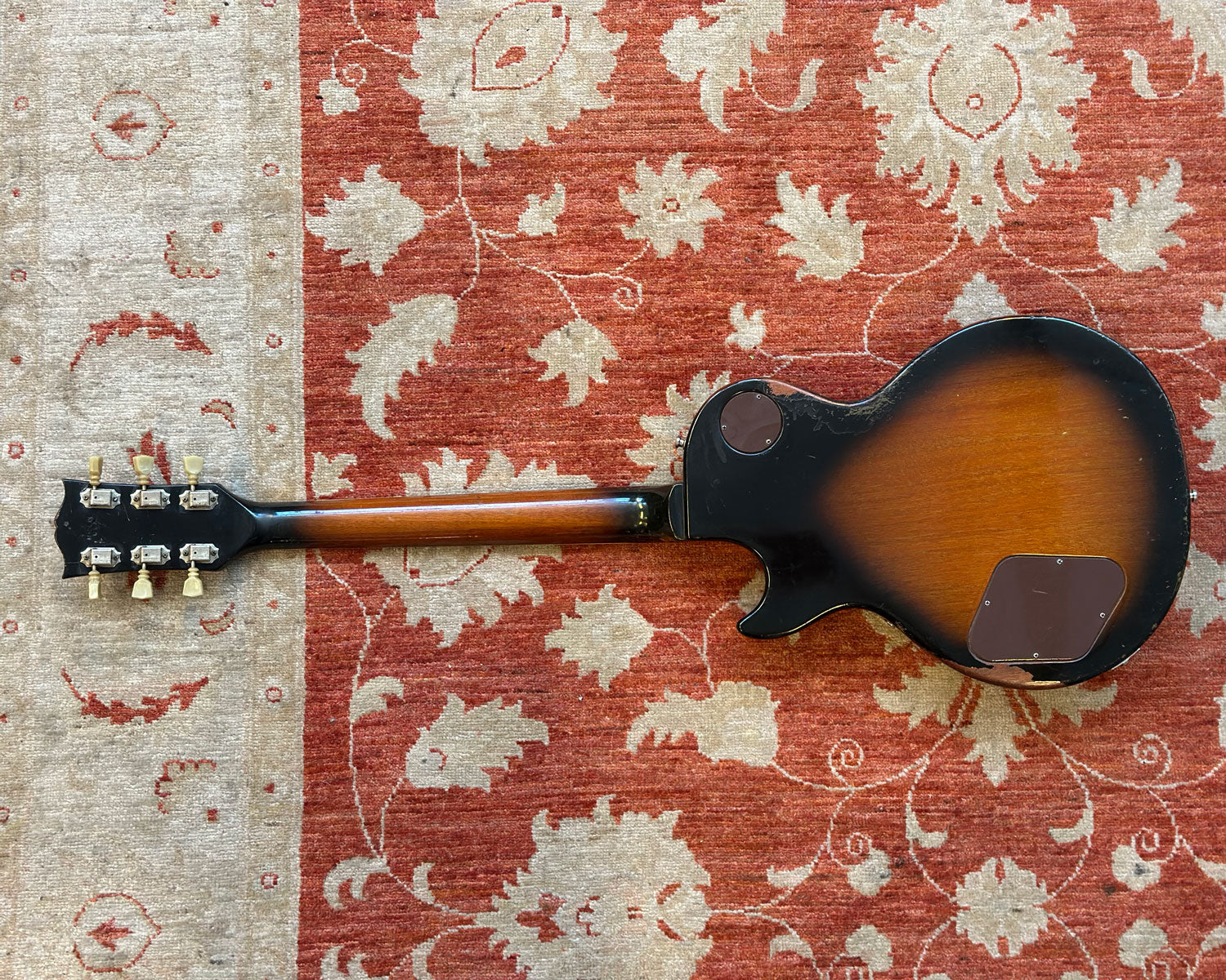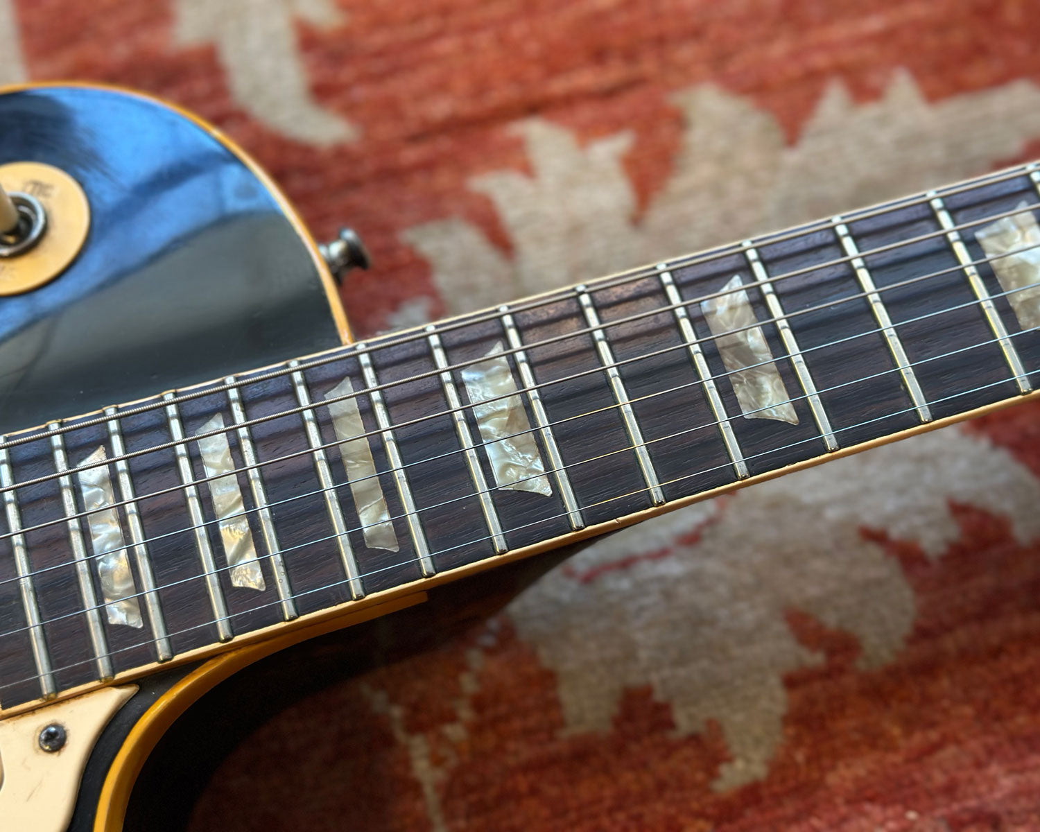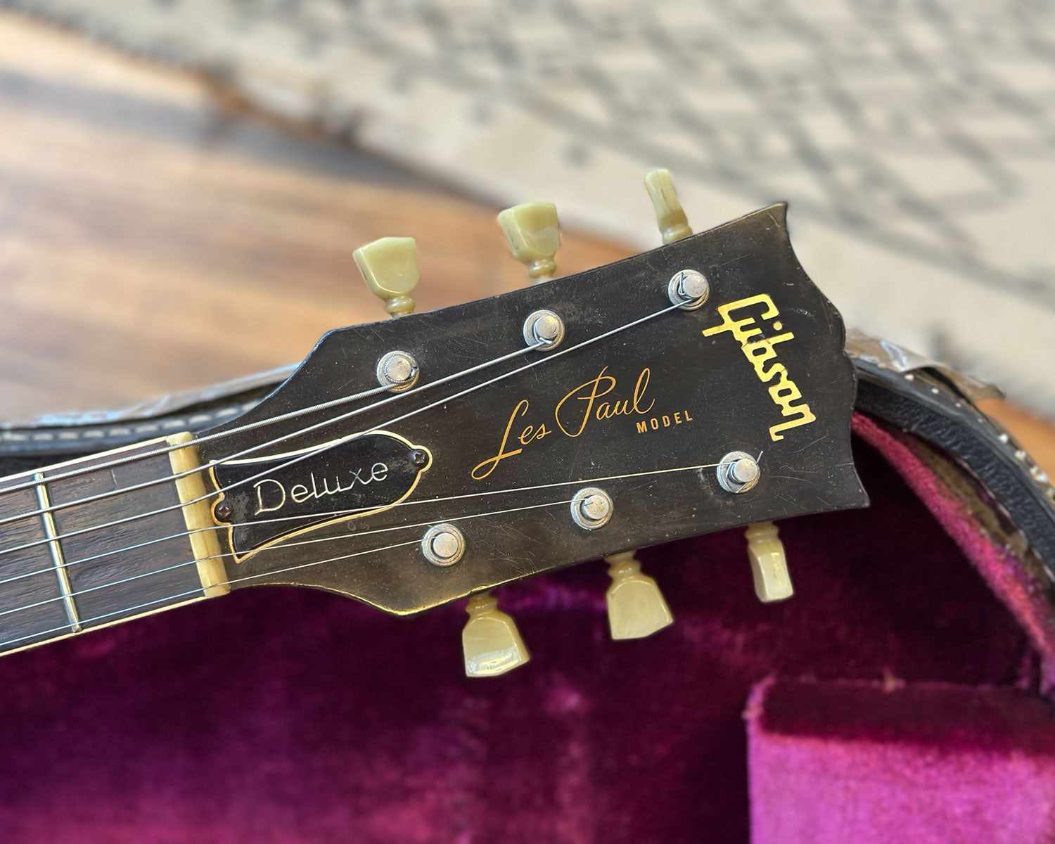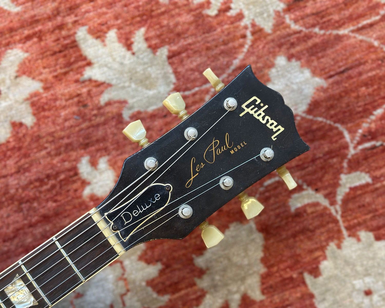 Binding is worn and cracked in places. Finish burn on headstock from wall hangers. Refretted with jumbo frets long ago, now showing pitting and relatively flat. Non original nut (bone). All top-hat knob tops are still in place however each is cracked, dented and showing some warping. Fully functional otherwise & just another bit of this LP Deluxe's rock'n'roll history.