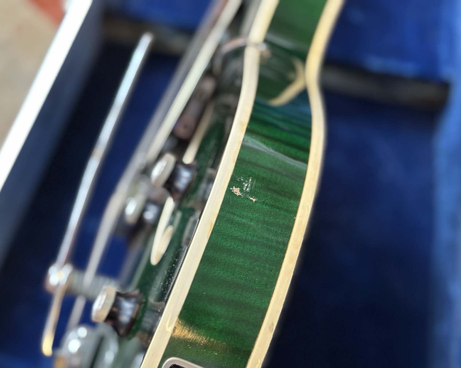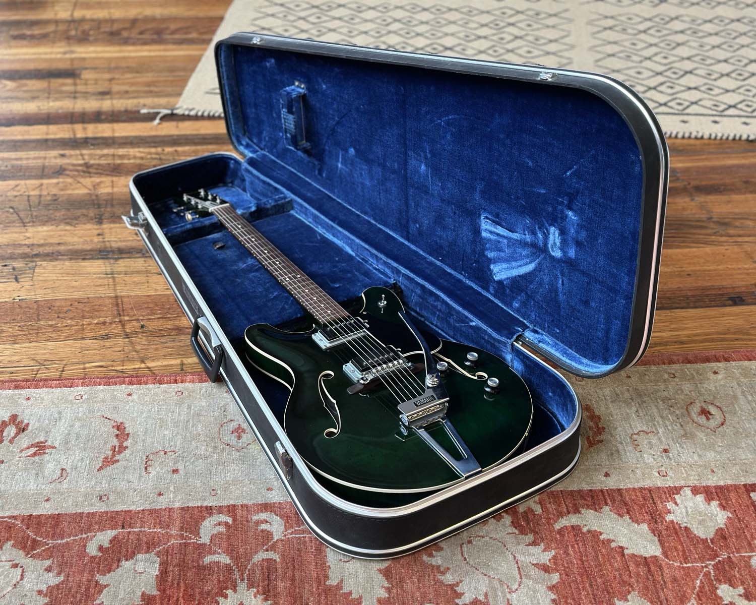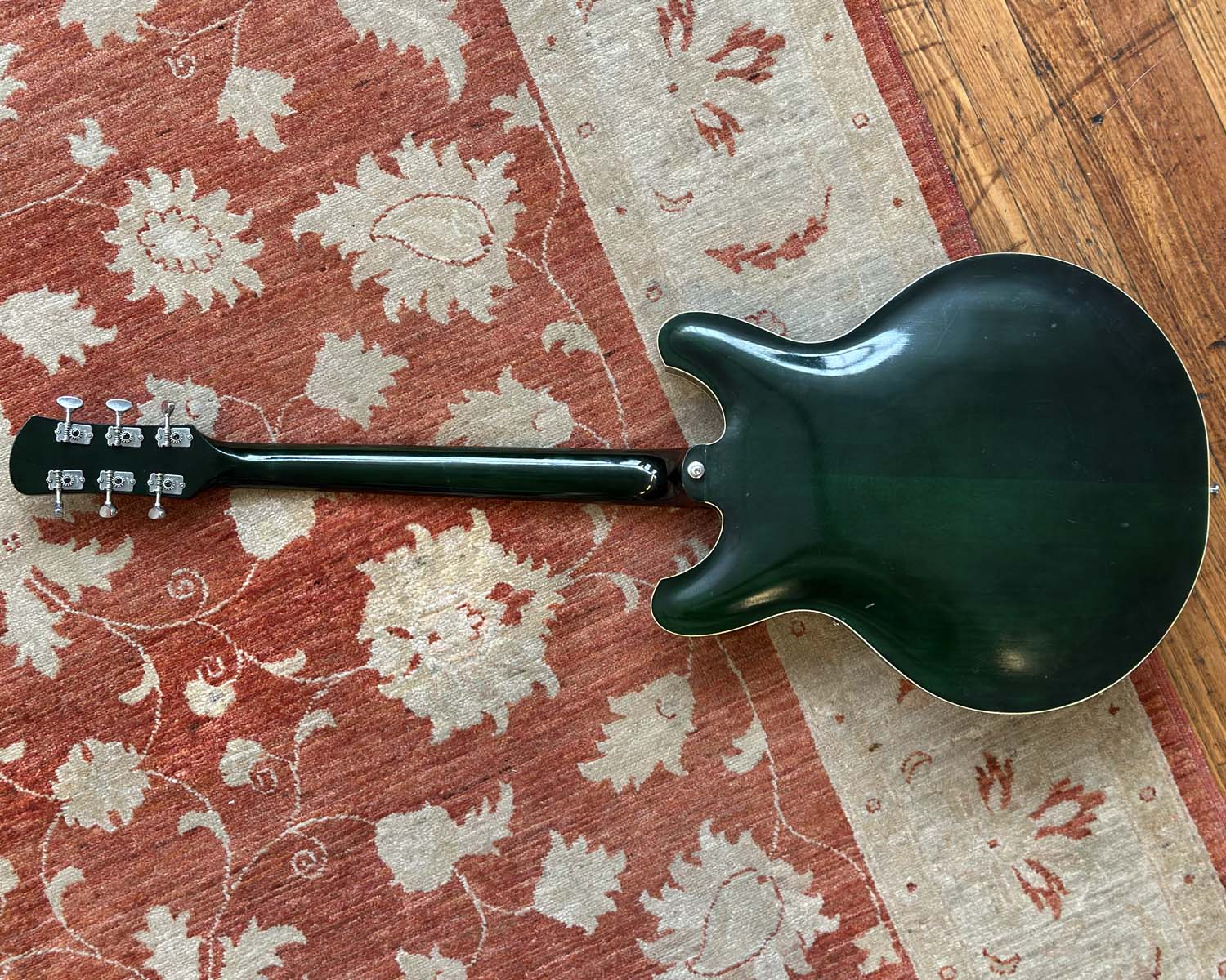 Beautiful 1968 symmetrical double cutaway semi-hollow with serious vintage charm. Finished in striking Alga Green, it features a near full-hollow maple body with a set maple neck and rosewood fingerboard, delivering warm, open tones with a subtle grit when pushed.