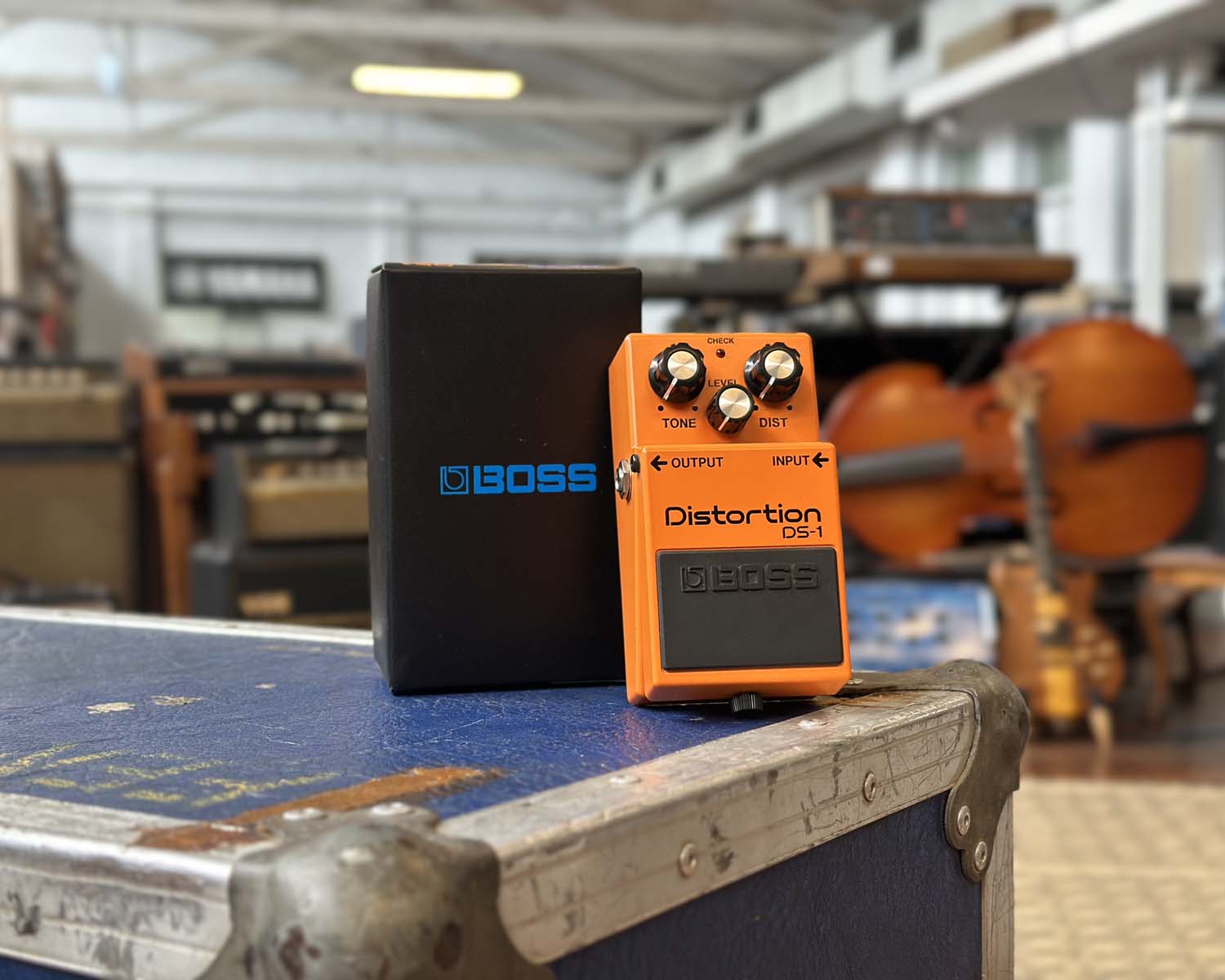 The Boss DS-1 Distortion. Is the quintessential clipping stomp box of several generations. A simple op-amp based distortion with hard clipping & scooped mid-range, it's both orange and iconic, perfect for feet inserted between amps and guitars.