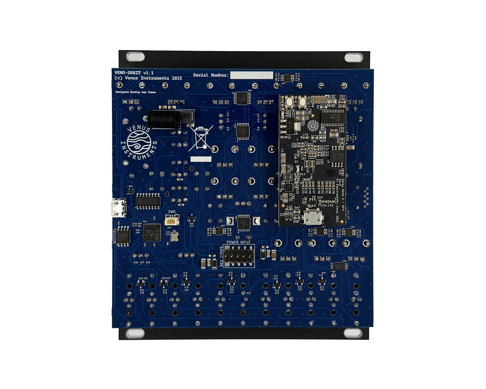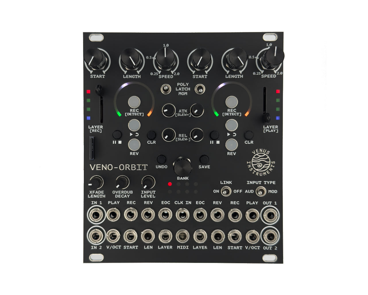 The Veno-Orbit is a dual channel, polyphonic, experimental sampler designed for live recording and manipulation of audio and CV. With an immediate user interface with no menus, 1 knob per function, and intuitive LED feedback, the module is quick and flexible, allowing for maximum creativity.