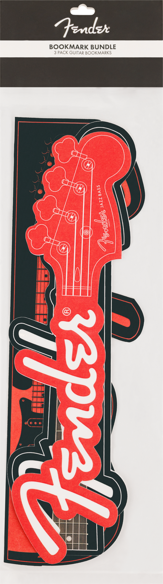 Fender paper bookmarks are shaped like mini versions of the famous Stratocaster guitar, plus the Jaguar & Jazz Bass headstocks. Printed on heavy, sturdy card stock and packaged as a 3 pack bundle.