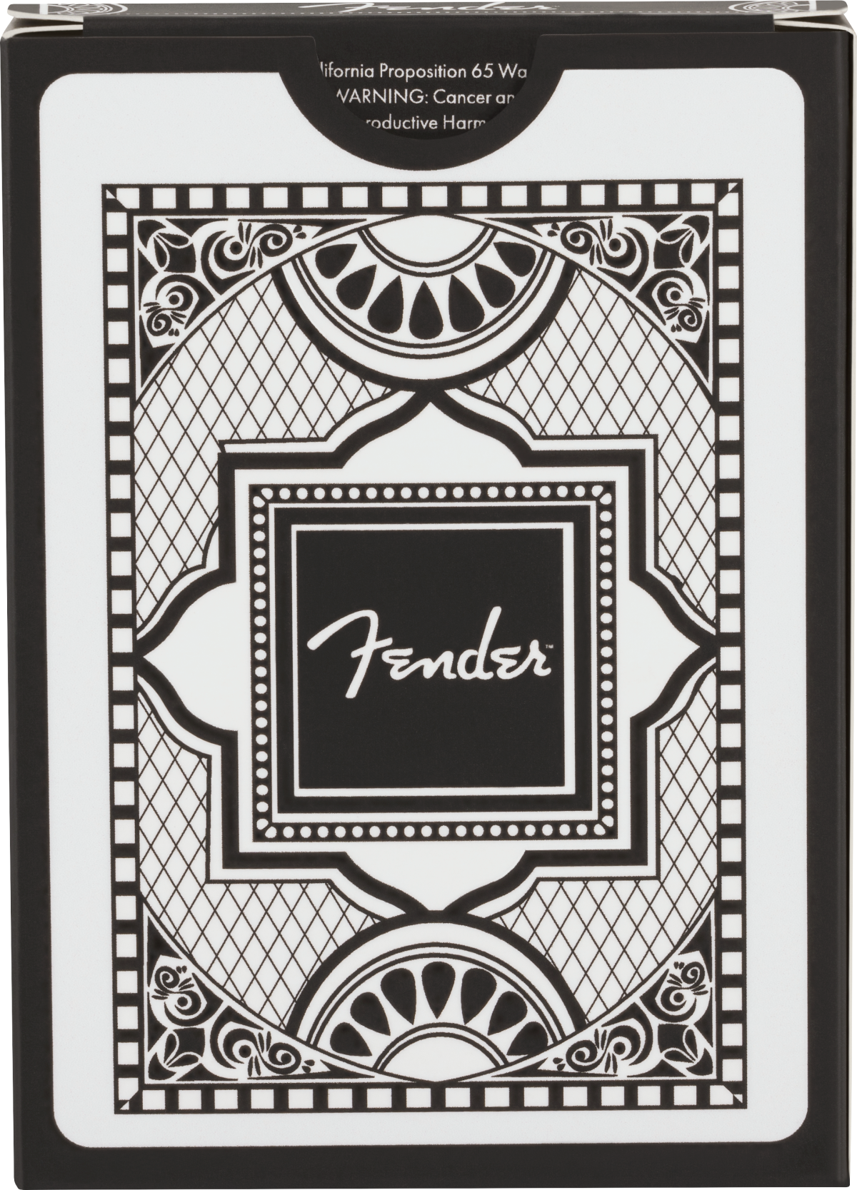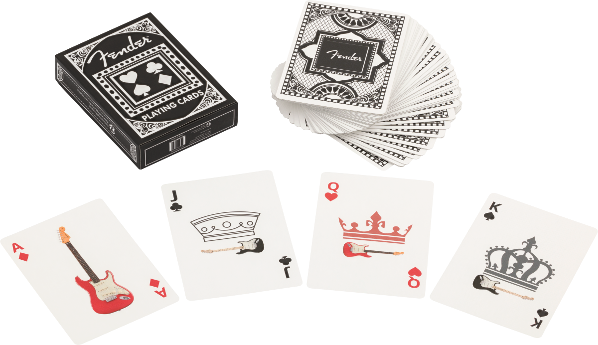 This specialty deck of cards designed with the iconic Fender Stratocaster features custom artwork that pays homage to Fender's most famous guitar. The deck is adorned with Fender's celebrated logo, along with imagery of the iconic Stratocaster.