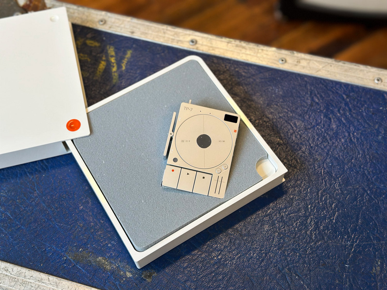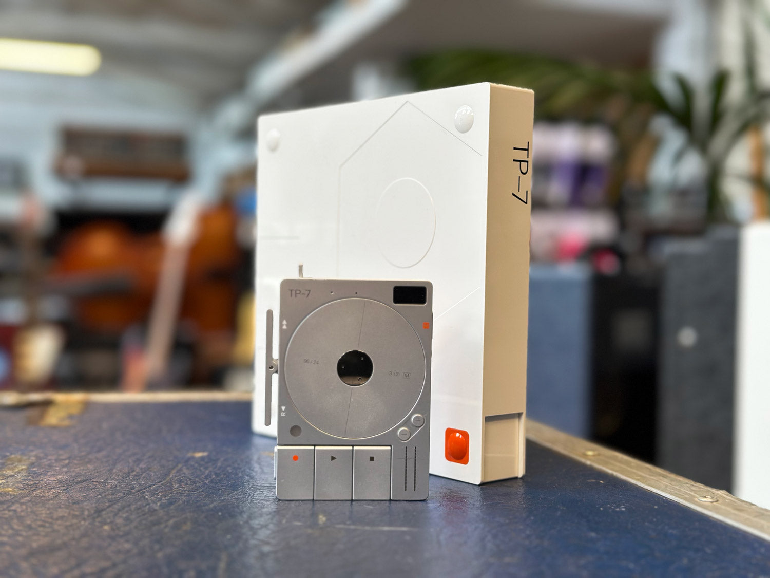 The TP-7 is a pocket-sized field recorder designed with Teenage Engineering’s trademark mix of utility and playfulness. At its heart is a spinning motorised wheel that controls recording, playback and scrubbing, turning audio capture into something tactile. It records in 24-bit/96kHz with 128GB of built-in storage, a built-in mic, and three flexible TRRS I/O jacks for external gear or headphones. A rocker bar handles fast-forward and rewind, while the dedicated memo button wakes the unit instantly to capture ideas on the fly. With multitrack layering, transcription support via app, and up to seven hours of battery life, the TP-7 is as much a creative sketchpad as it is a field recorder.