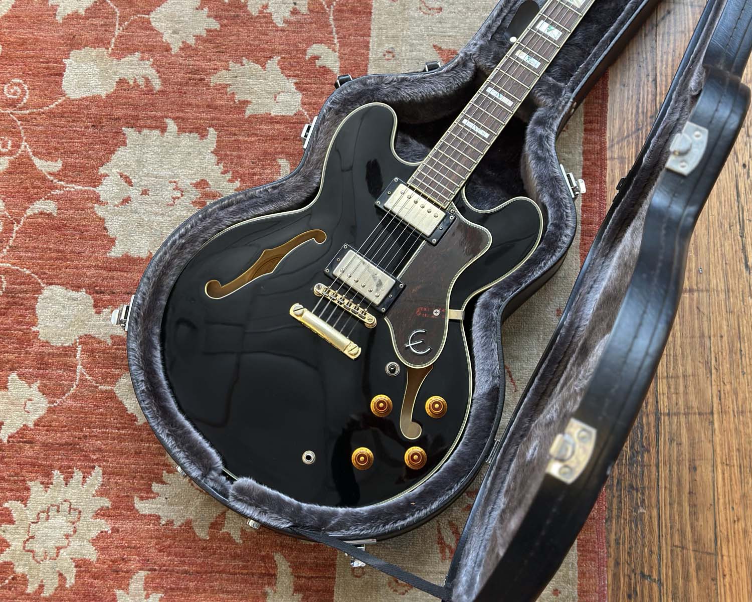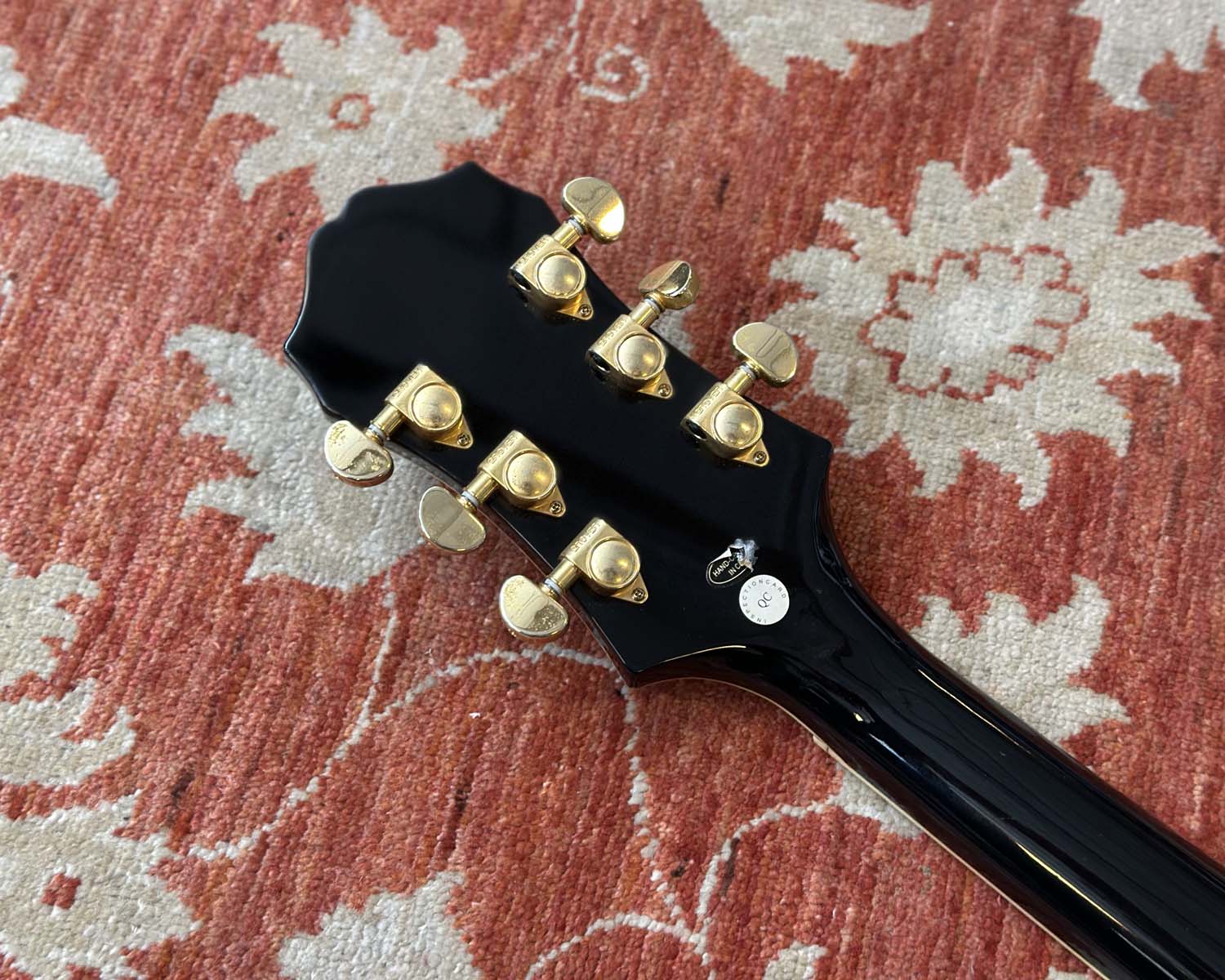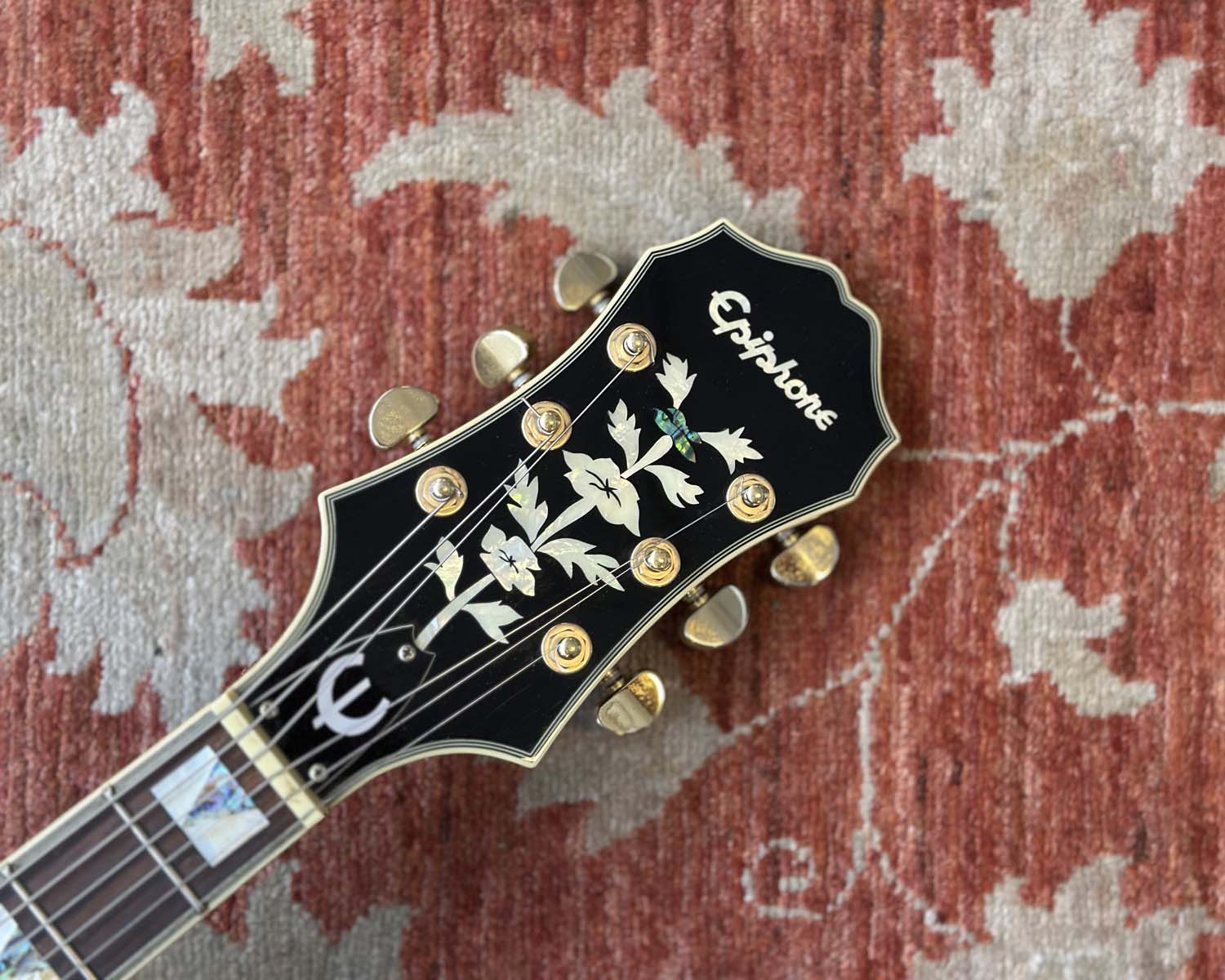 The Sheraton II carries Epiphone’s long tradition of semi-hollow elegance, first introduced in the late 1950s as a high-end sibling to the Casino. Features laminated maple body with a solid centre block for feedback resistance, multi-ply binding, gold hardware and nice block/triangle inlays. Outfitted with Epiphone’s Alnico Classic humbuckers, it delivers warm, jazzy cleans and gritty blues drive, a favourite for players chasing tones in the vein of John Lee Hooker, Noel Gallagher and Brian Aubert of Silversun Pickups.