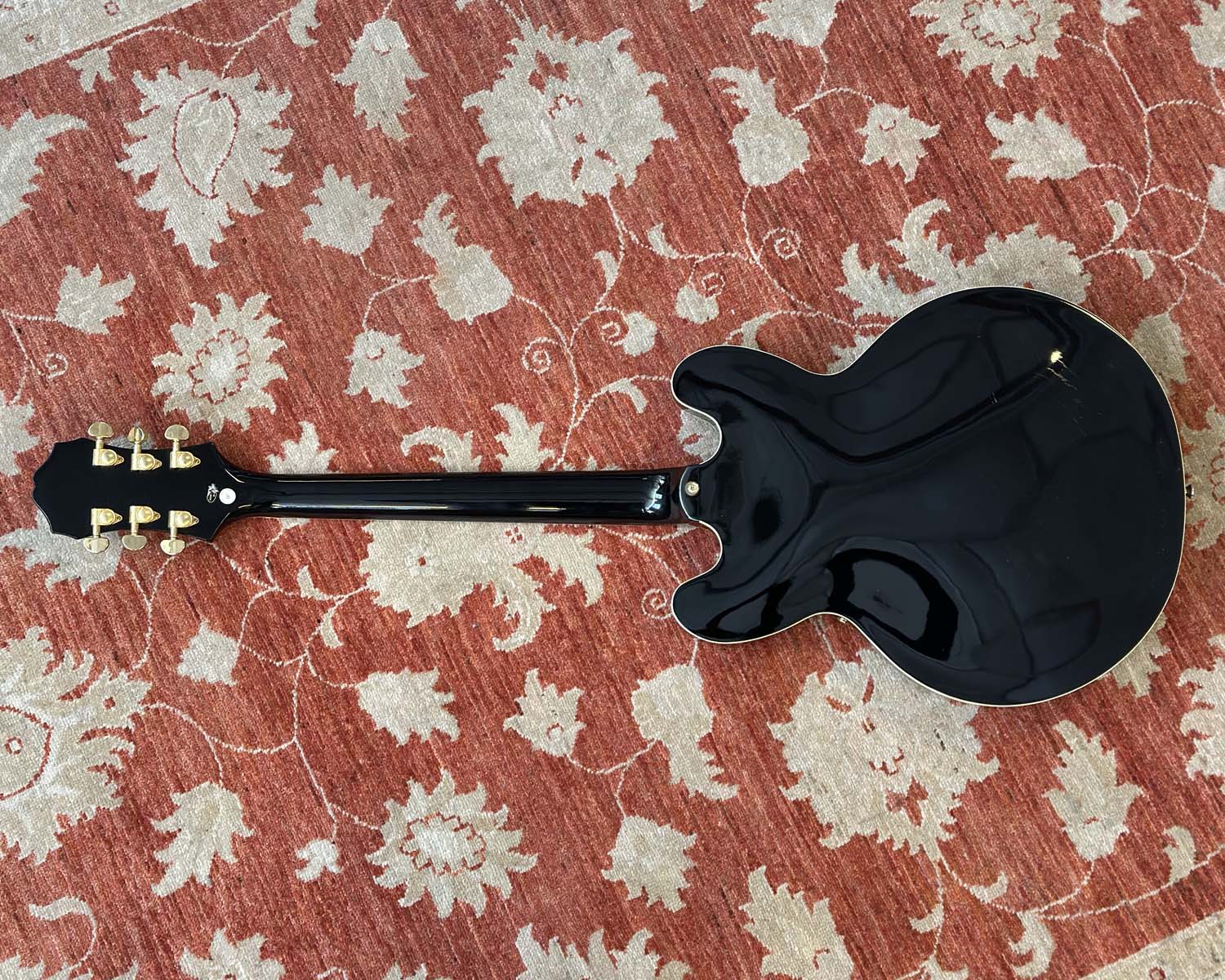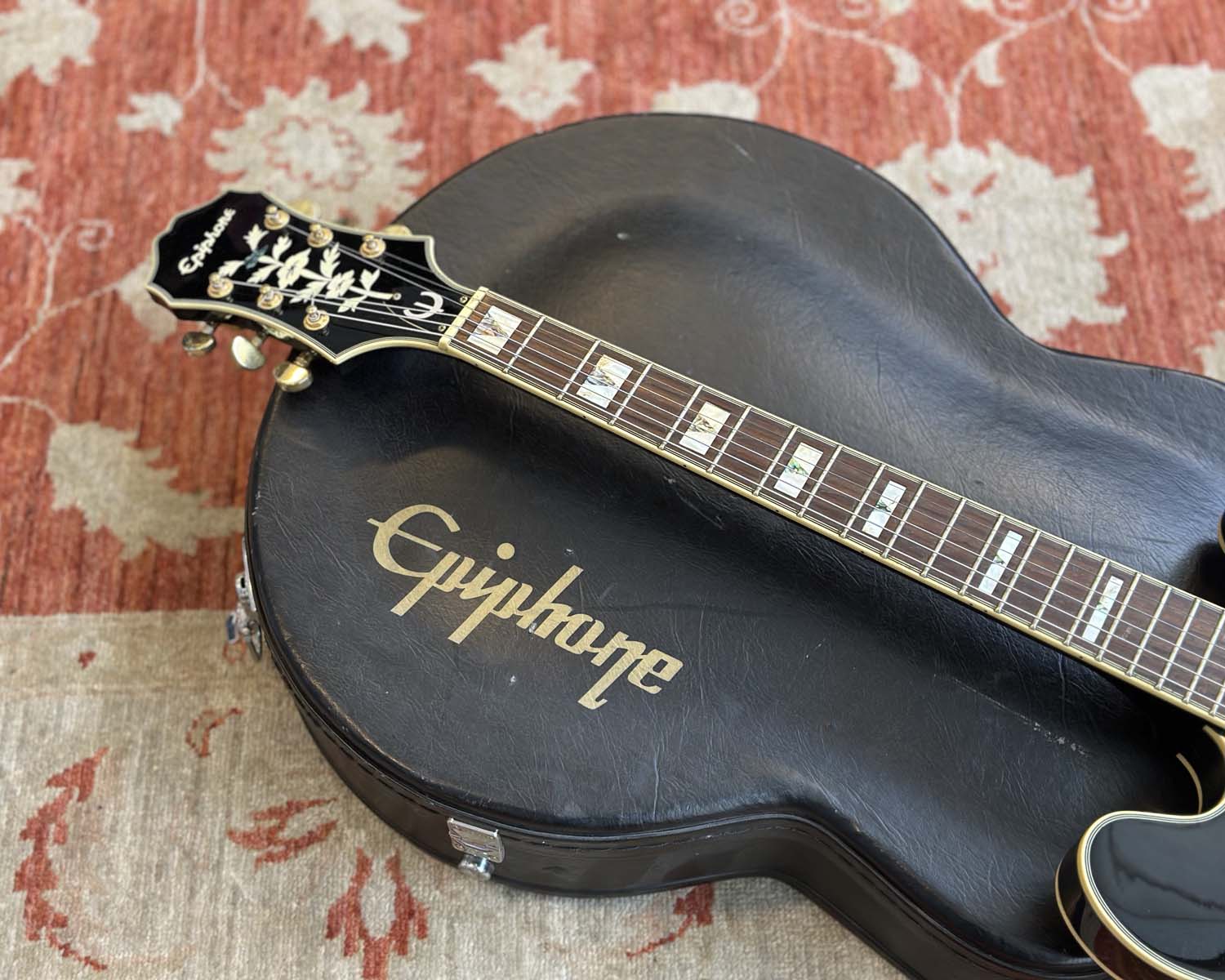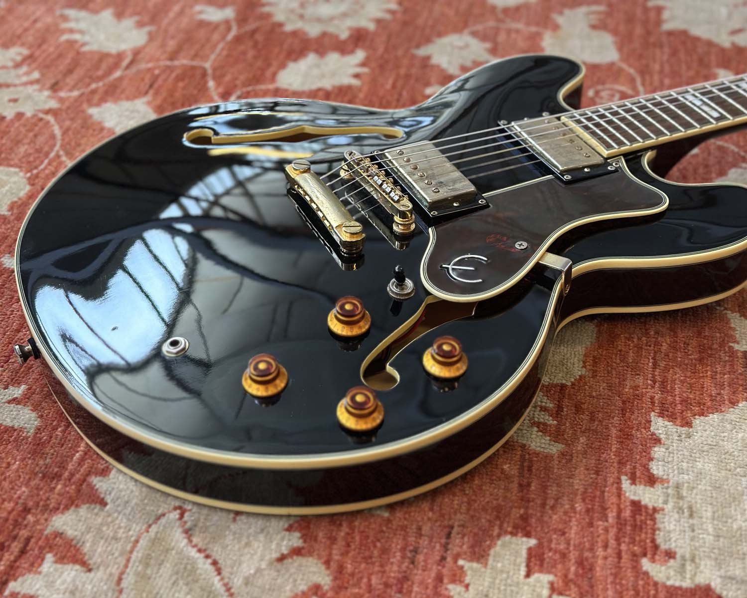 The Sheraton II carries Epiphone’s long tradition of semi-hollow elegance, first introduced in the late 1950s as a high-end sibling to the Casino. Features laminated maple body with a solid centre block for feedback resistance, multi-ply binding, gold hardware and nice block/triangle inlays. Outfitted with Epiphone’s Alnico Classic humbuckers, it delivers warm, jazzy cleans and gritty blues drive, a favourite for players chasing tones in the vein of John Lee Hooker, Noel Gallagher and Brian Aubert of Silversun Pickups.