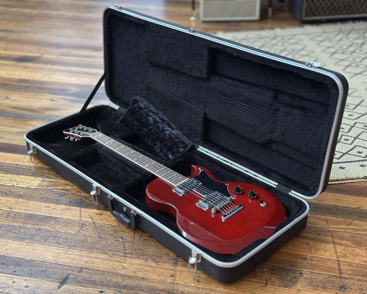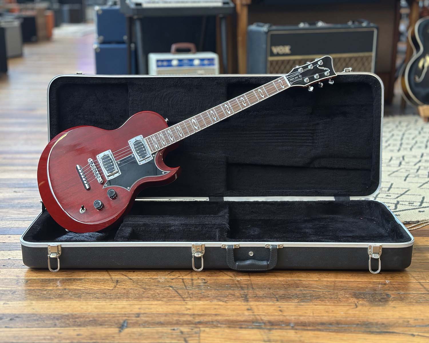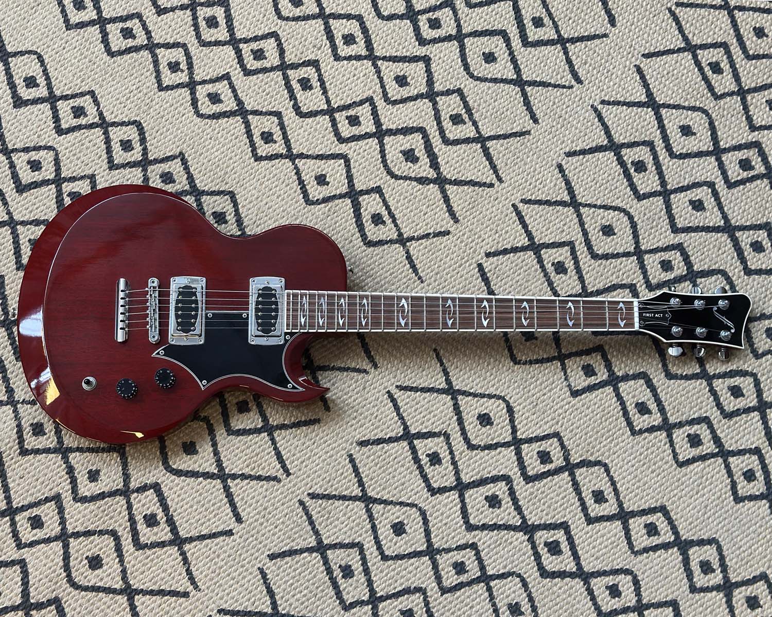 Built in Boston during the short-lived First Act Custom Shop era, the exceedingly rare Lola was part of a small batch of hand-crafted US guitars that aimed squarely at top boutique market in the mid-2000s. Beautifully resonant solid beveled mahogany body featuring maple cap, gloss cherry finish, pinstripe binding, ebony fretboard with split anvil inlays. Famous customers of First Act Custom Shop include guitarists from Mastodon, Paul McCartney, and The Cure.