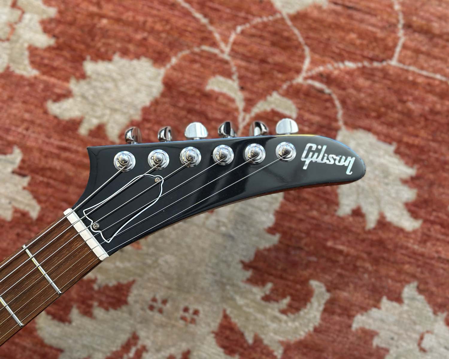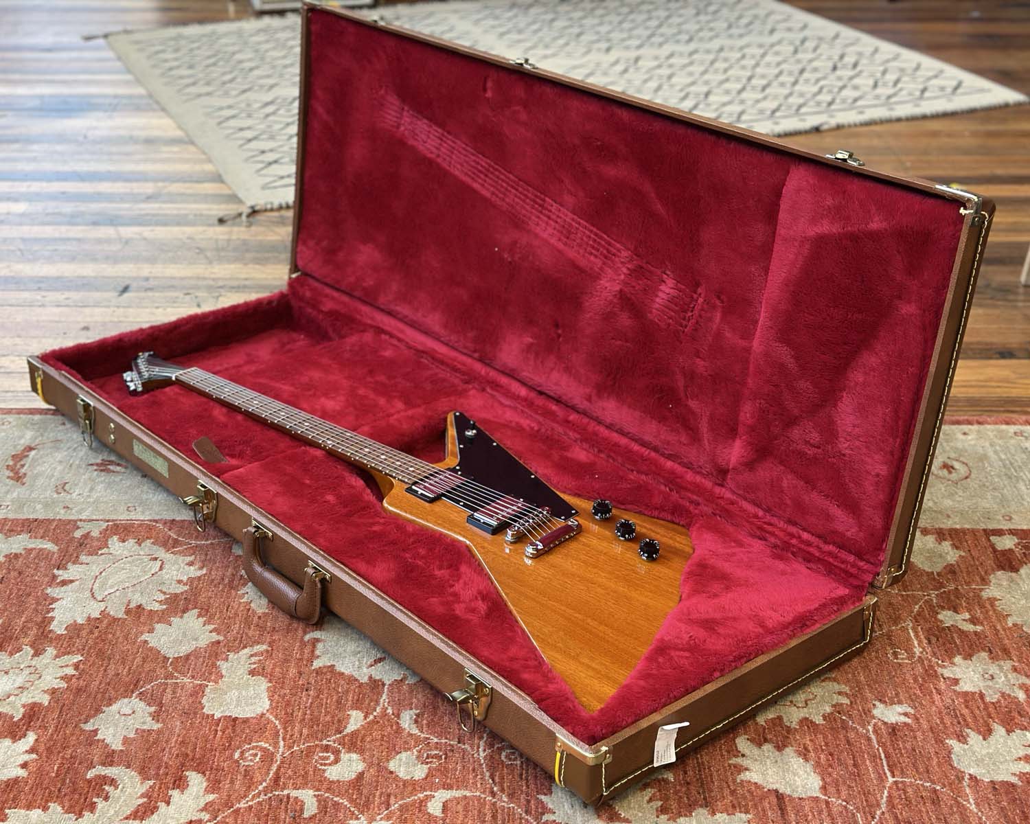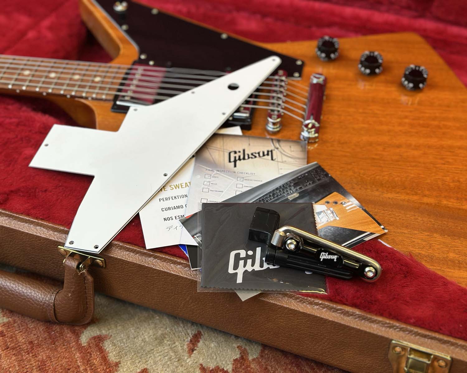 White pickguard has been replaced with a stylish black one. Includes original Gibson brown leather case, original white pickguard, documentation and accessories.