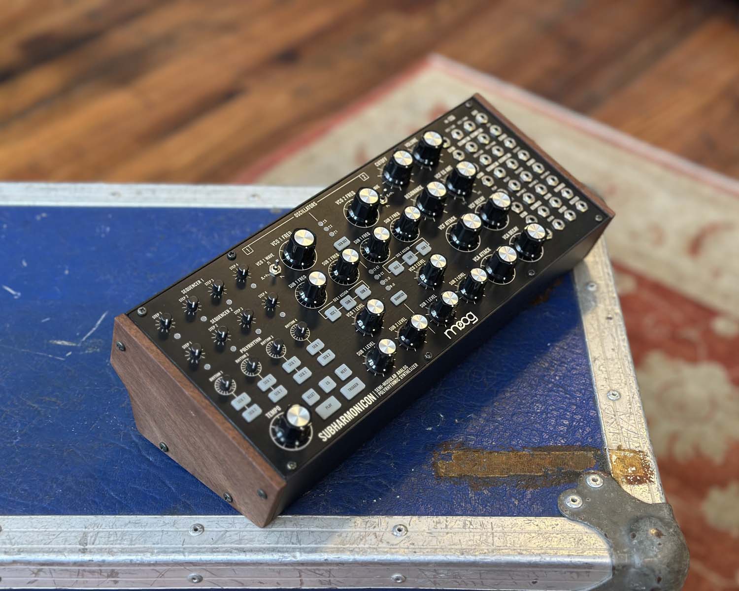The Moog Subharmonicon is a semi-modular analog synthesizer that combines subharmonic generation with polyrhythmic sequencing. It features two VCOs, each paired with two subharmonic oscillators, enabling the creation of complex harmonic textures. Its dual 4-step sequencers and four rhythm generators allow for intricate polyrhythmic patterns. Equipped with a classic Moog ladder filter and a 32-point patchbay, it offers extensive sound-shaping capabilities.