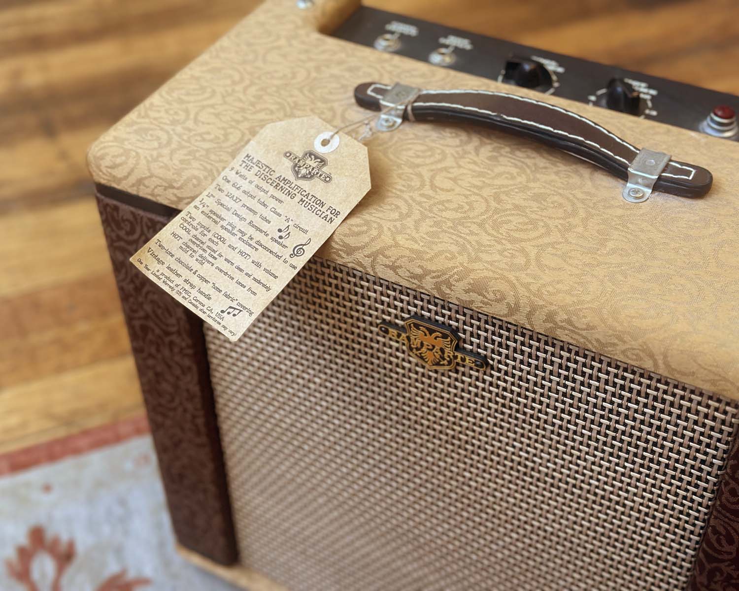 Dual channel 9 Watt 1X12" Pawn shop series class A valve combo running a single 6L6 power valve & two 12AX7 preamp valves. Two channels, "Cool" for warm cleans and slight grit, and "Hot" for overdrive from mild to wild, each with separate inputs. Features 12″ Special Design Ramparte speaker (8 ohm at 20W), chocolate and copper "home decor" covering and vintage leather strap.