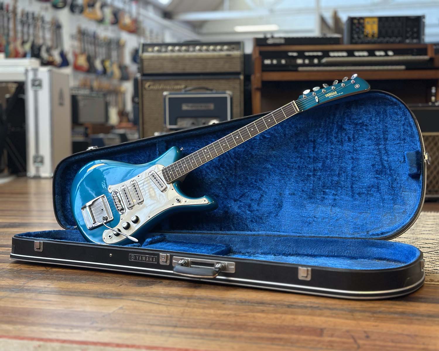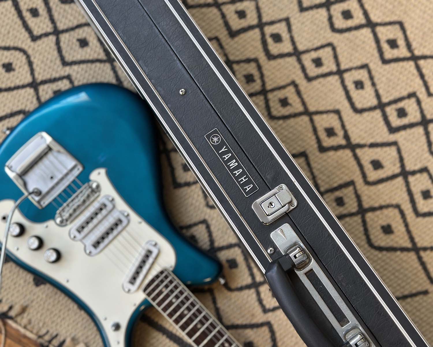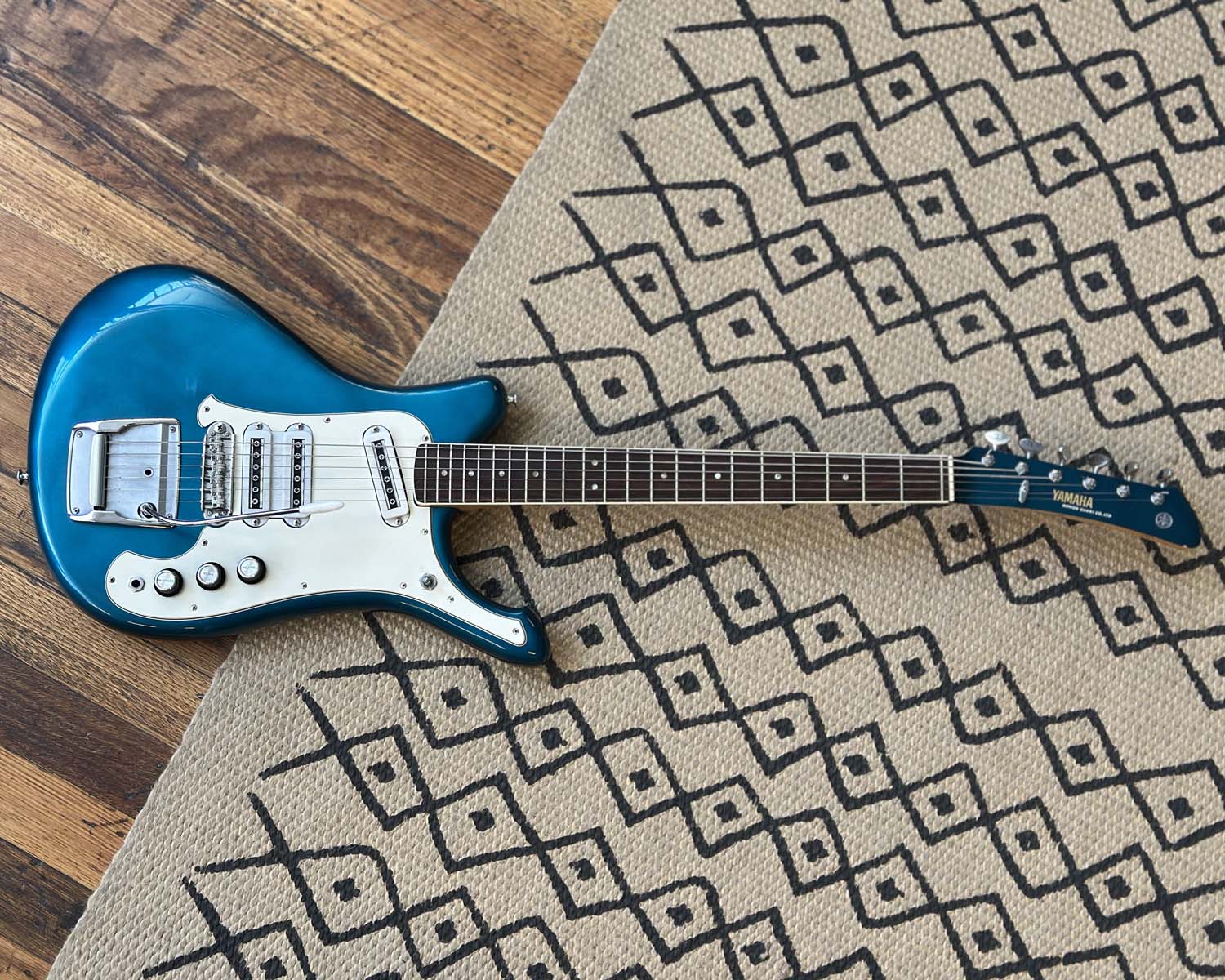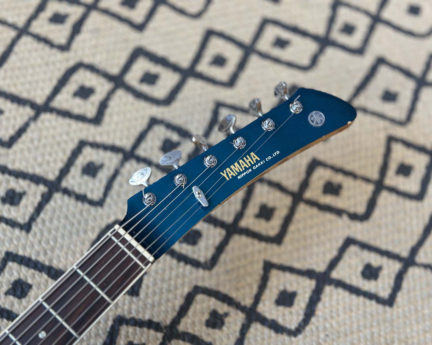Very rare 1968 Yamaha SG-5A AKA the "Flying Samurai" in Metallic Candy Blue (matching headstock) with bound maple neck & rosewood fingerboard, featuring zero fret. Three way pickup selector and a balancer control for the two bridge pickups (with the ability to combine them into a faux-humbucker). Chrome hardware including Yamaha branded tuners. Weirdly versatile tone but almost purpose built for the psych and surf heads out there . Made in Japan.