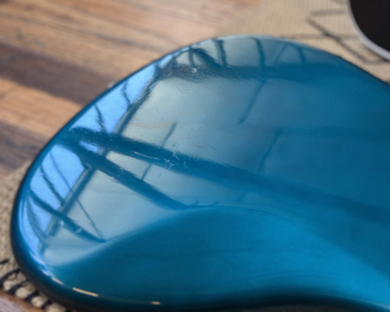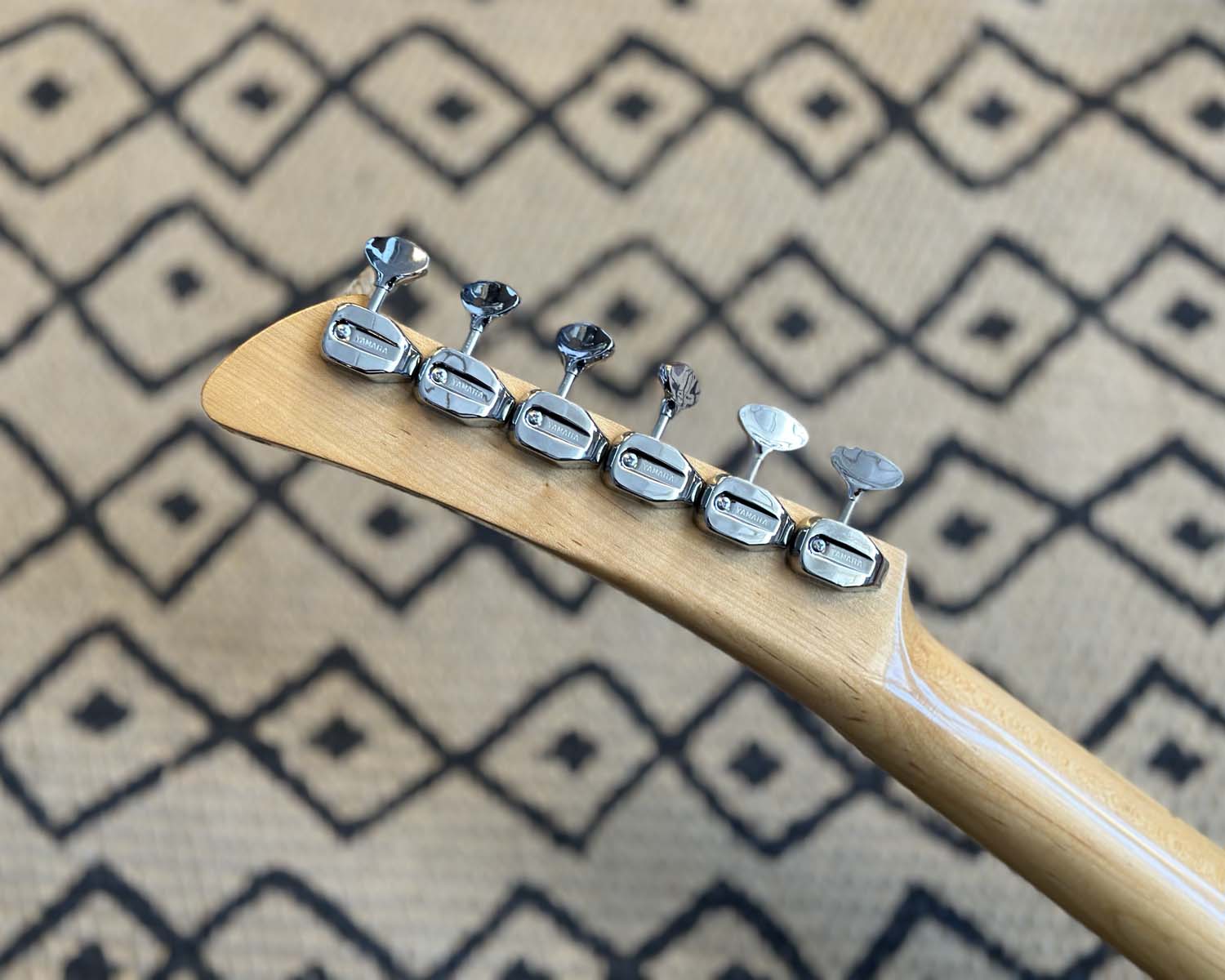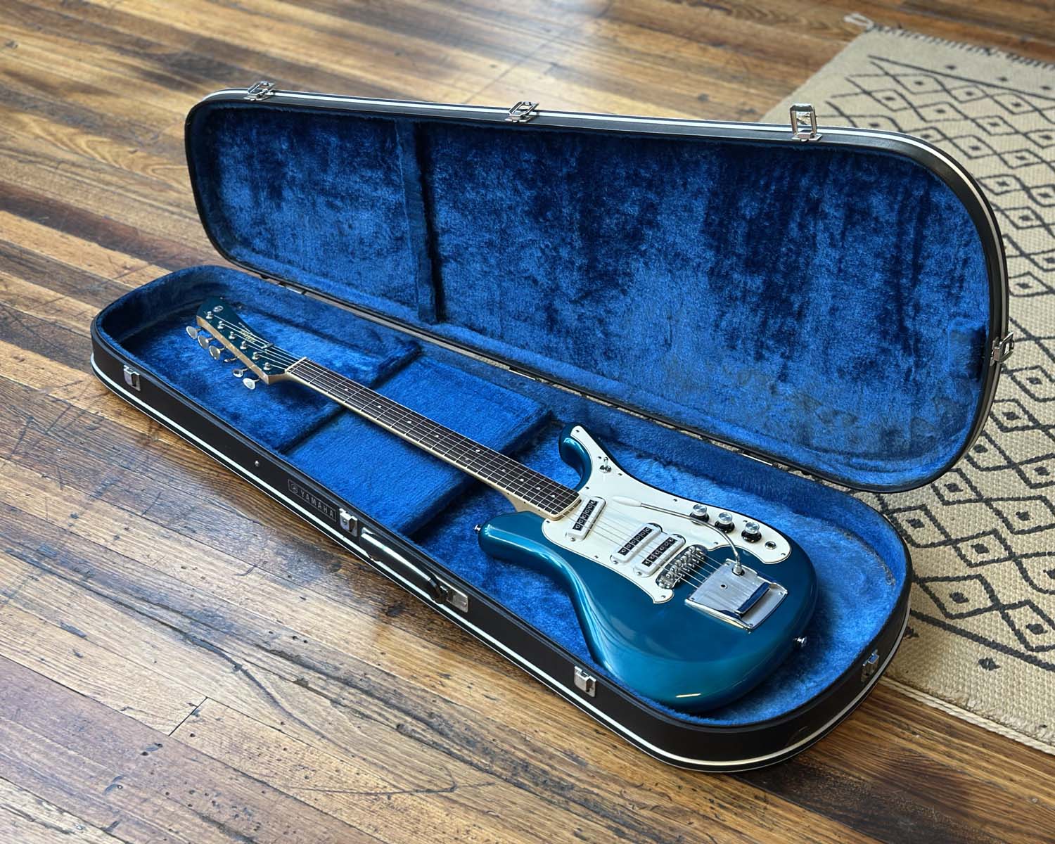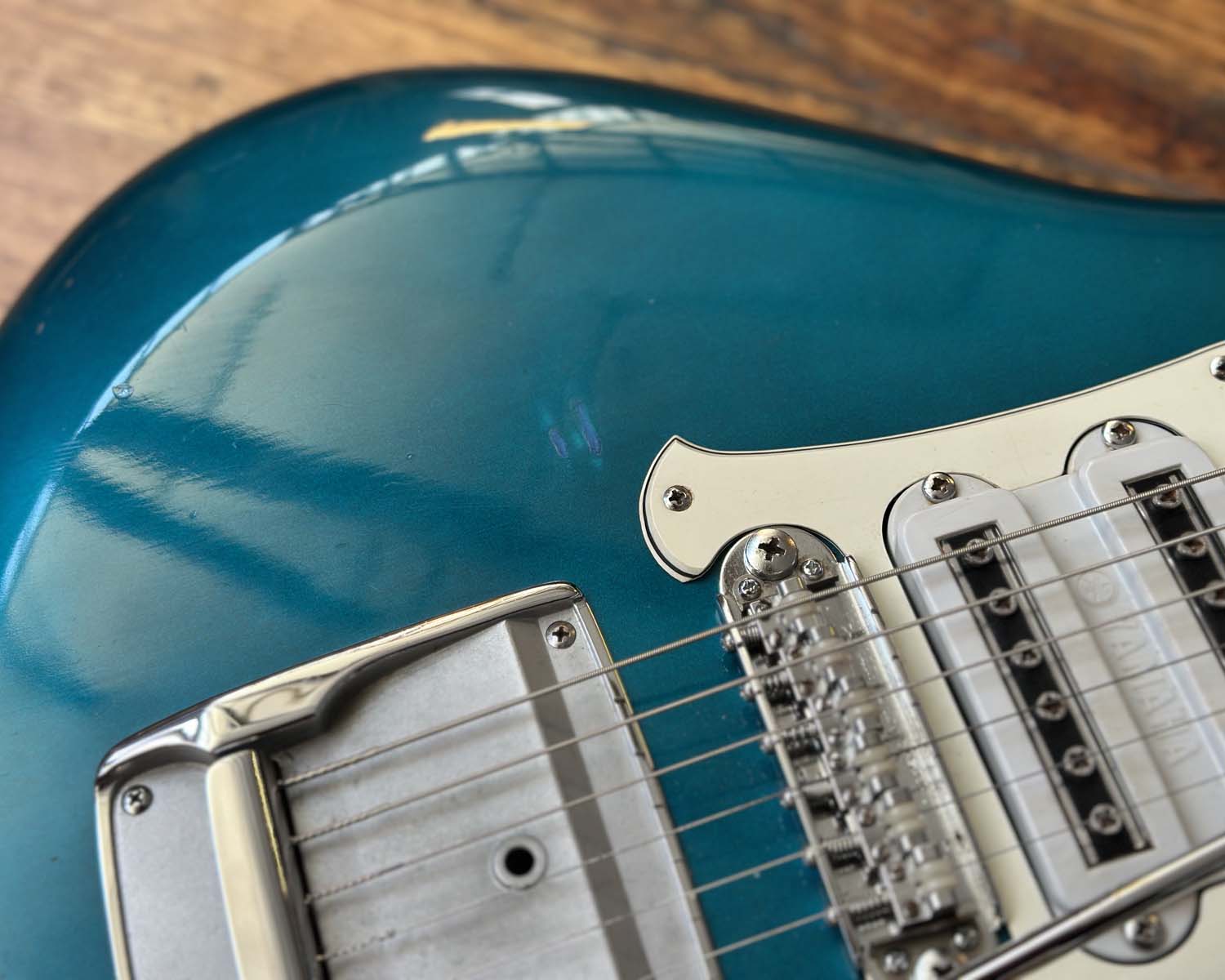 Very rare 1968 Yamaha SG-5A AKA the "Flying Samurai" in Metallic Candy Blue (matching headstock) with bound maple neck & rosewood fingerboard, featuring zero fret. Three way pickup selector and a balancer control for the two bridge pickups (with the ability to combine them into a faux-humbucker). Chrome hardware including Yamaha branded tuners. Weirdly versatile tone but almost purpose built for the psych and surf heads out there . Made in Japan.