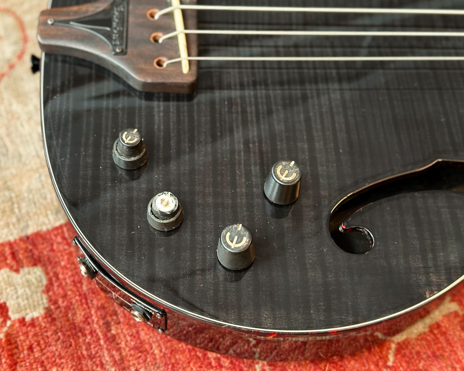 Jazz-box with mahogany body, flame-maple veneer and F-holes with onboard Shadow NanoMag (fingerboard edge) and NanoFlex (under the saddle) pickups with powerful active electronics.