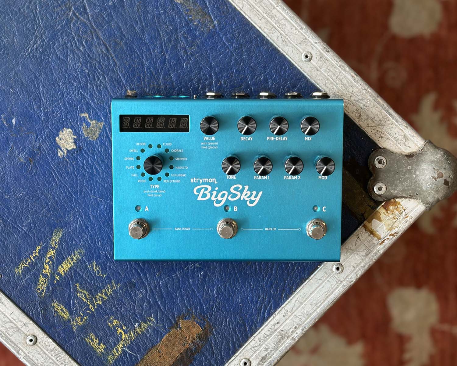 Along with being MIDI controllable, the Big Sky features ultra low noise 24-bit 96kHz converters & controls for Decay, Pre-delay, Mix, Tone, Mod, Low-End, Mid, Size, status LED, patch display, stereo input and output, plus a toggleswitch for feedback loop & an expression pedal input.