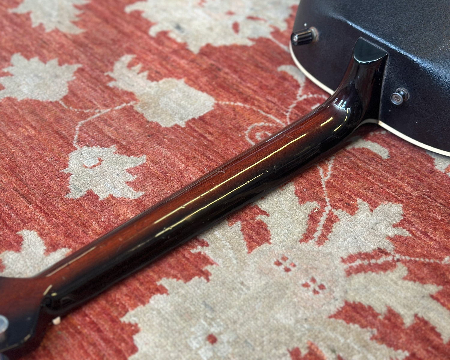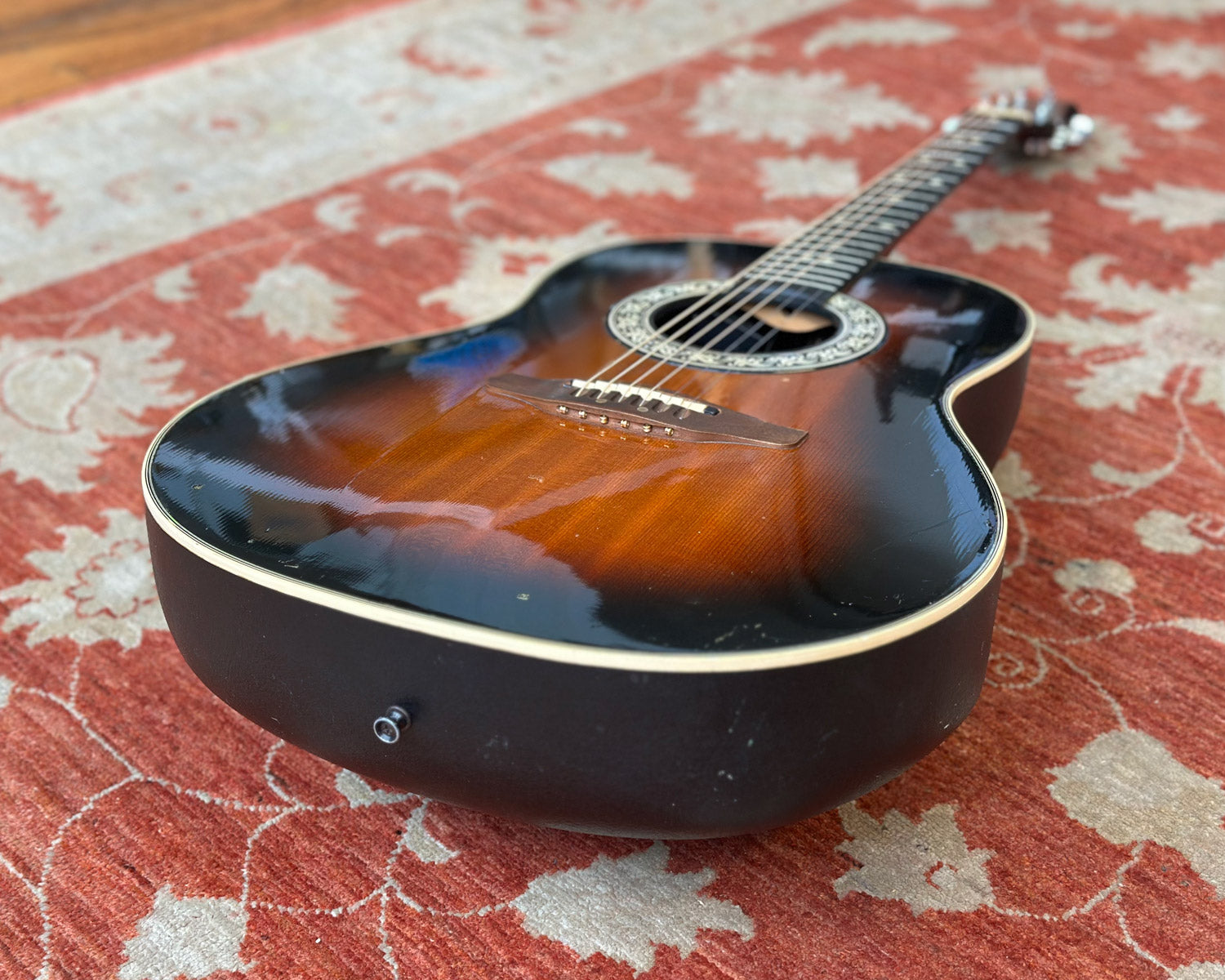Includes original Ovation fibreglass hard shell case. One of the latches on the case is broken. Volume knob may have been replaced. Scuffs and signs of medium wear and tear pictured; there are significant cracks across the top face. Guitar weight: 2.66kg