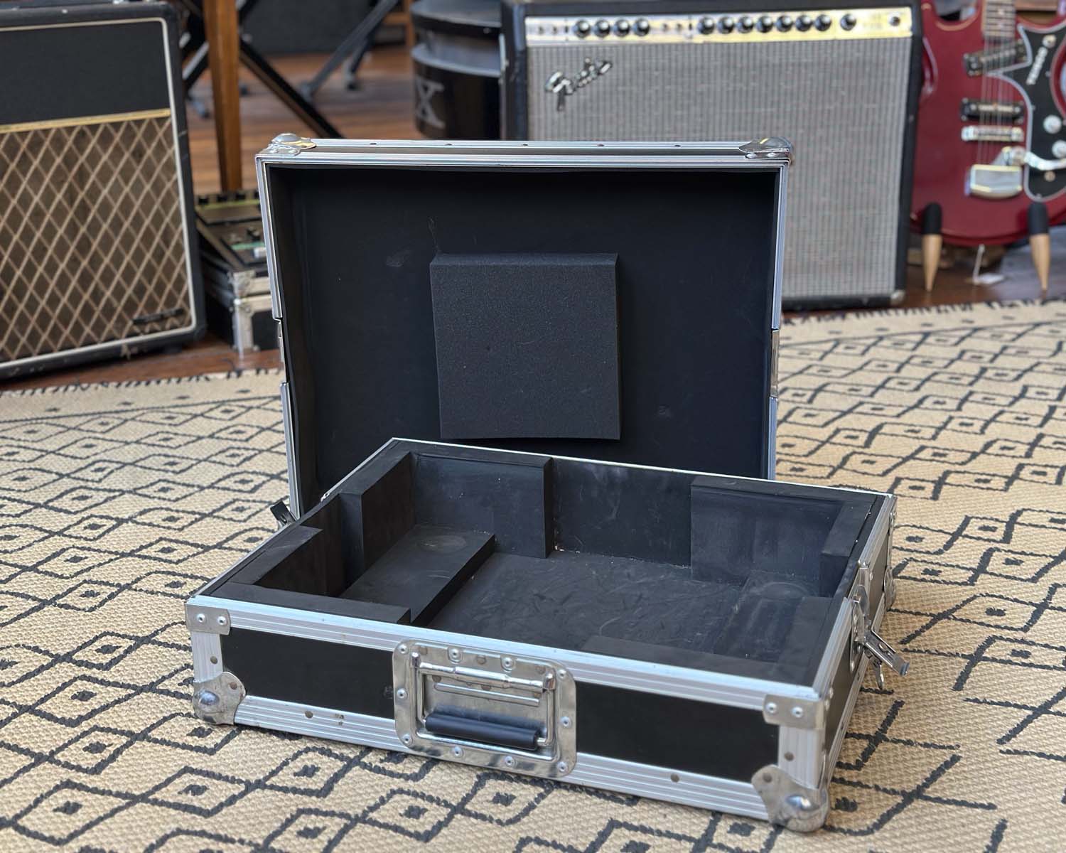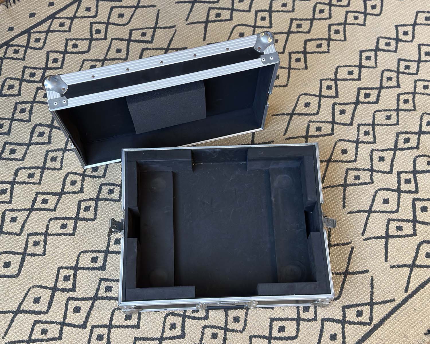 Heavy duty road case with shaped firm foam interior, perfect for small pedal boards, synths, drum machines or DJ gear! Made to perfectly fit Pioneer CDJs or similar sized equipment. Two butterfly latches and one handle, rounded steel corners.
