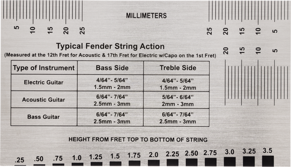 Made from durable 20-gauge stainless steel, this compact tool measures string and pickup height with clear inch and millimetre markings. An etched reference chart on the surface makes it simple to set factory-spec action on electric, acoustic, and bass guitars.