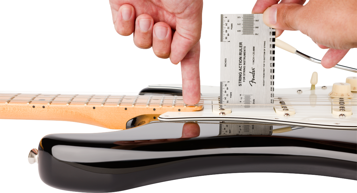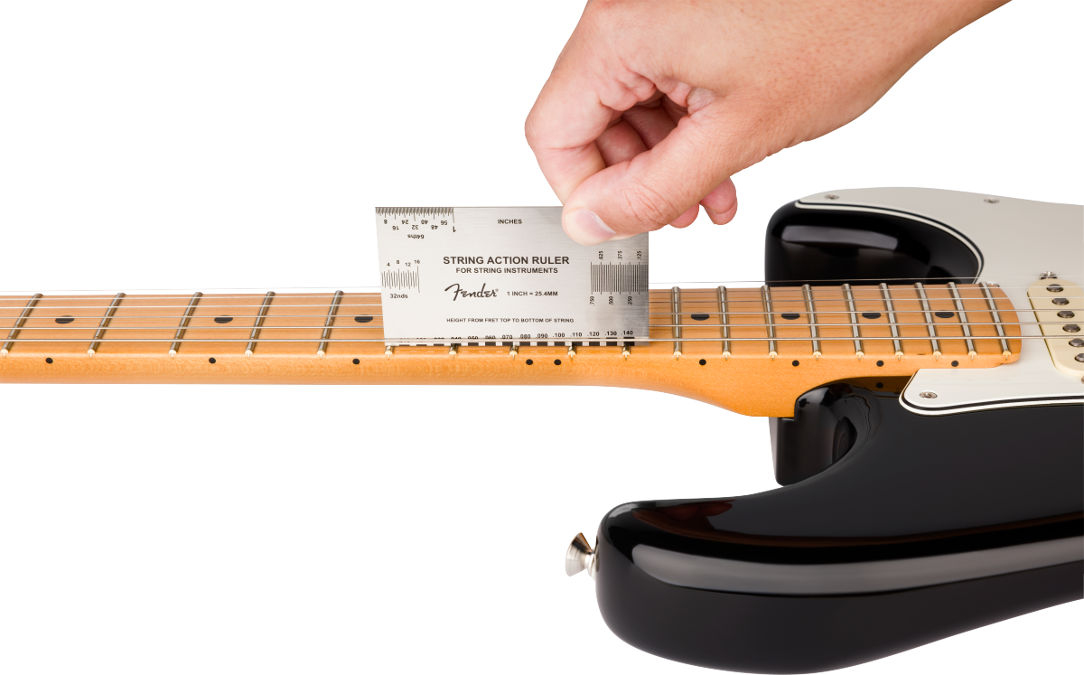 • Built-in reference guide: Displays Fender's factory-recommended string action specifications for electric guitars, acoustic guitars, and bass guitars.