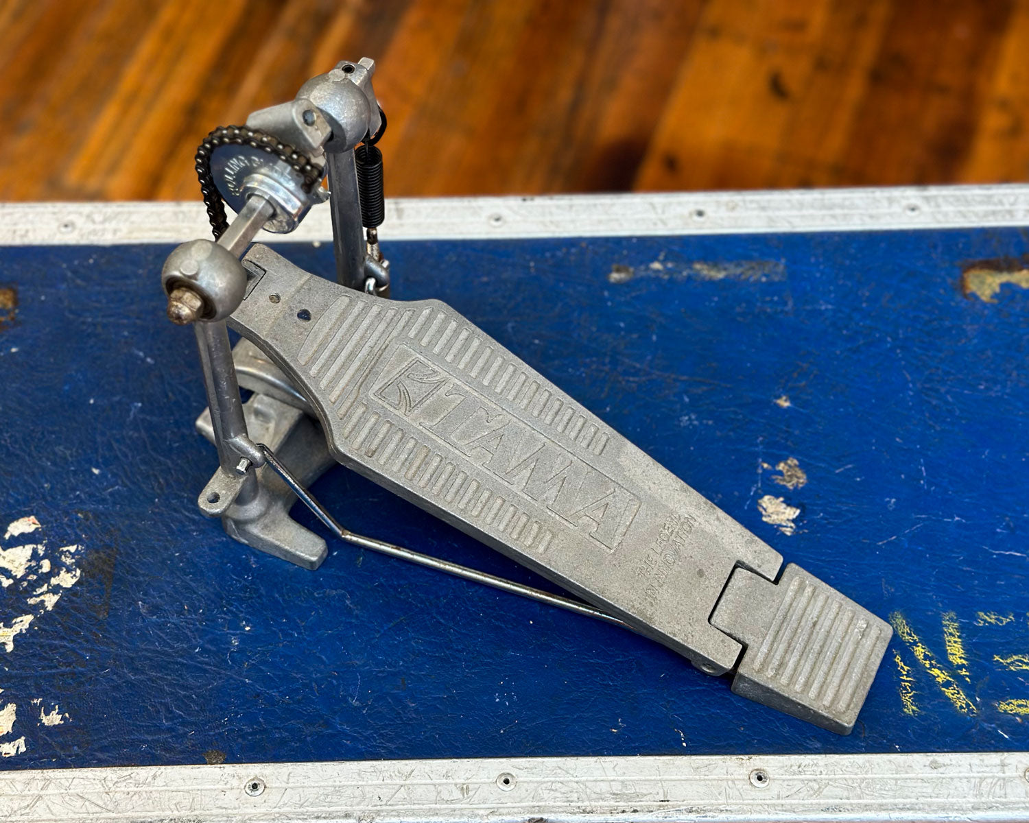 This is a circa 1970 chain operated kick pedal by Tama. This pedal has single spring adjustable.