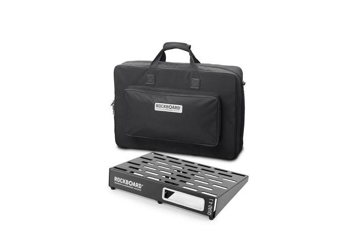 RockBoard QUAD 4.1 with Gig Bag The new 2018 RockBoard® pedalboard series has been completely re-designed to create a pedalboard that is lightweight, rigid and rugged, and allows for the use of a multitude of pedals as well as power supply mounting solutions. Its uniquely ingenious construction is based on only one folded, cold-rolled aluminum sheet for the board frame and has not a single welded seam. This makes the board surface completely plain and gives you more pedalboard space for your money. U-shaped vertical support braces offer additional stability without adding too much weight. The new RockBoard® pedalboards will neither bend nor wiggle. The innovative slot-based design works equally well with the new RockBoard® Quick Mount pedal mounting plates (sold separately) as well as with standard mounting solutions (e.g. hook and loop tape, cable ties). The slots also let you easily hide cables underneath the surface for a neat and tidy setup. Additionally, any power supply can either be mounted underneath the board surface, or using the optional RockBoard® The Tray universal power supply mounting solution. All RockBoard® 2018 Series models (except Duo 2.1) are compatible with the RockBoard® MOD patchbays. With seven sizes ranging from 46 cm (18 1/8") to 102 cm (40 3/16") in width, we are sure you will find the perfect board for your needs. All sizes are available with either gig bag or flight case.