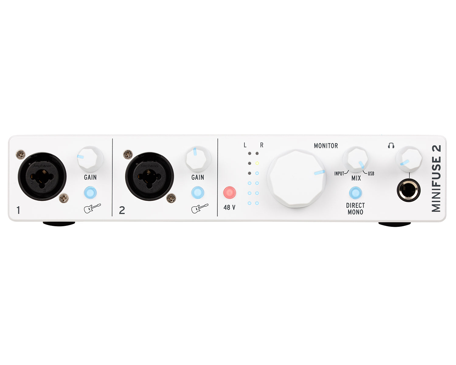 - Backlit controls: MiniFuse’s knobs light up in response to your input, turning red when the signal is too high
