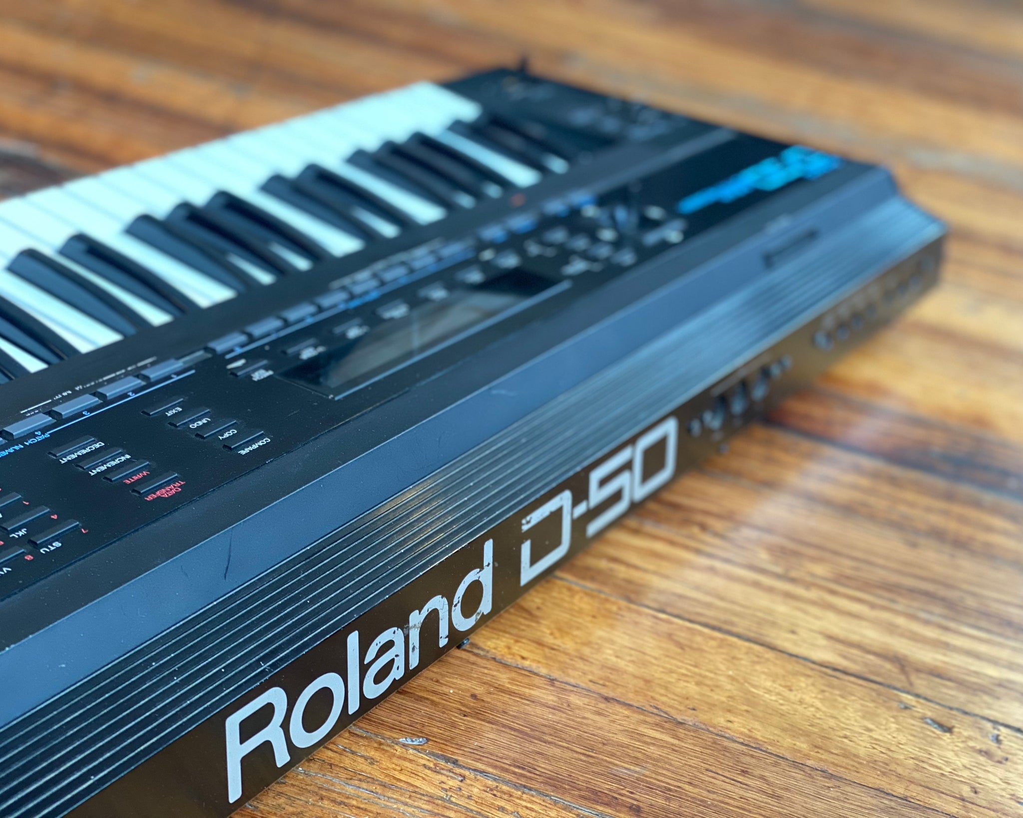 One of the finest digital synthesisers of the late 1980s; the Roland D-50 debuted in 1987 to compete with the popular Yamaha DX-7. Utilises Roland's patented Linear Arithmetic Synthesis which combined sample playback & digital synthesis including resonant filtering. The D-50 was Roland's flagship keyboard audio synthesising unit. Made in Japan.