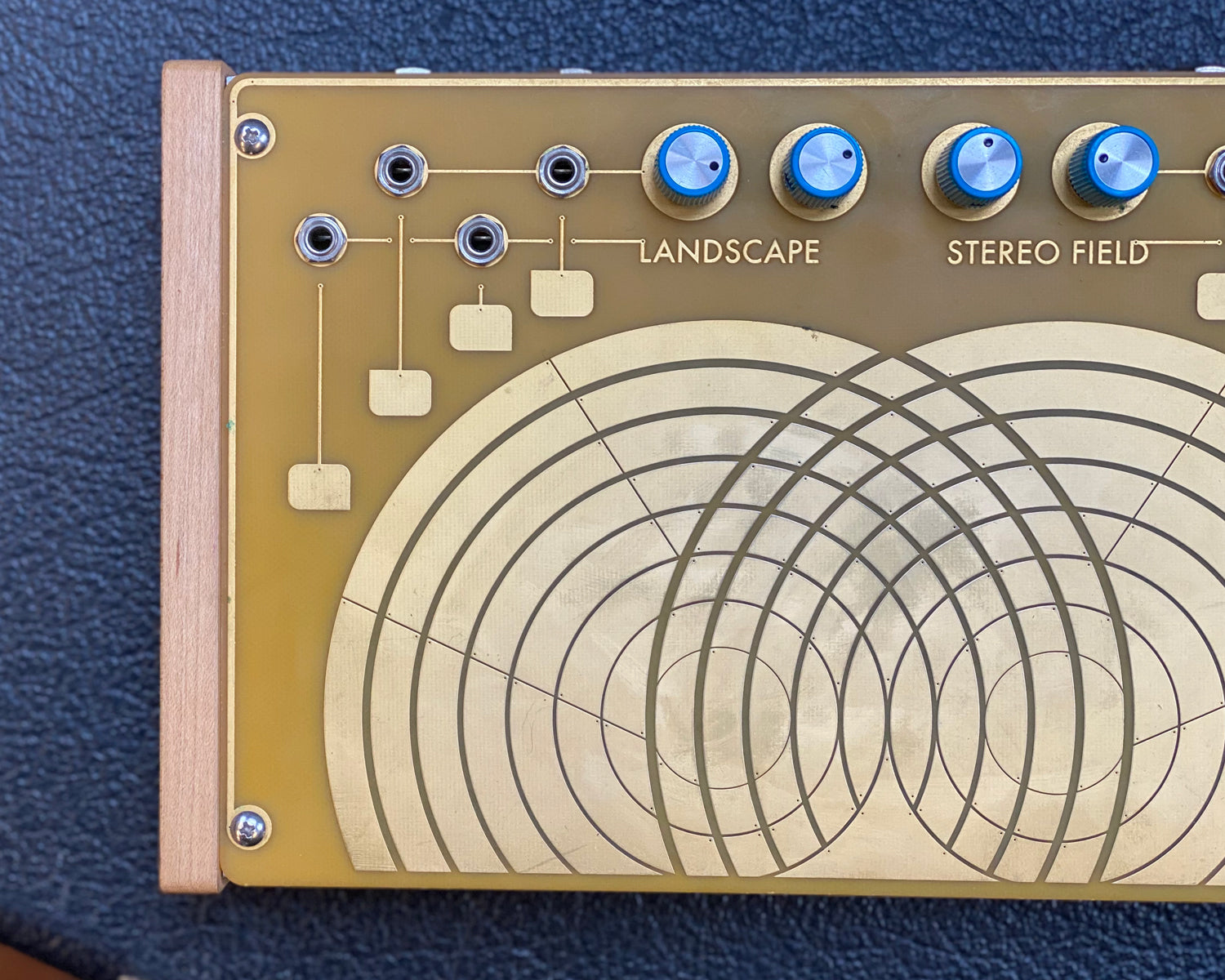 The Stereo Field allows its user to manipulate and patch two analogue stereo preamp circuits via touch plates. By utilising skin conductivity as new paths for current to follow you are creating "new circuits" and new sounds in relation to where your fingers are patching. The individual touch plates are directly connected to nearly every connection point of every component in its circuitry (located directly under each corresponding touch plate). When touched with multiple fingers it will create atonal analogue feedback with either of the two mirrored circuits represented by interlocking touch-plate circles. The resulting feedback can go beyond the abilities of human hearing (Take caution!) and down to the very slow clicks of a saw waveform and both can often be happening simultaneously. These parallel mirrored circuits can be finger patched separately or together yielding vastly different chaotic results in regards to texture, timbre and stereo imaging.