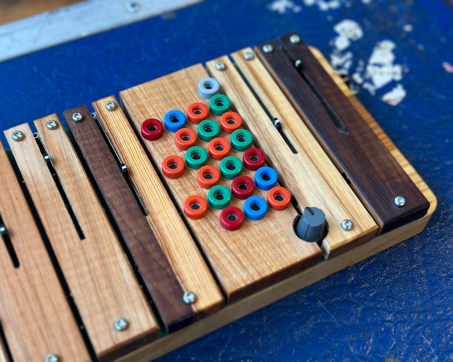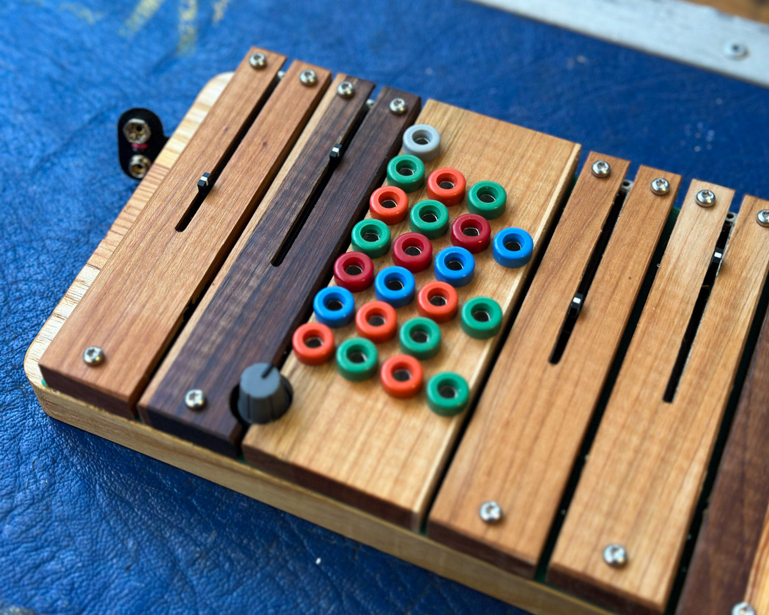 The Sidrax is a touch based electronic instrument with seven oscillators each controlled by a wooden bar and able to be fine tuned using the faders within. There is also a master pitch knob and a master chaos knob. While the fundamental or pure sound of the oscillators is a sweet sounding triangle wave, the master chaos knob can be utilised to increase the modulation from one oscillator to the next in a circular pattern, adding some noise and washiness to your signal.