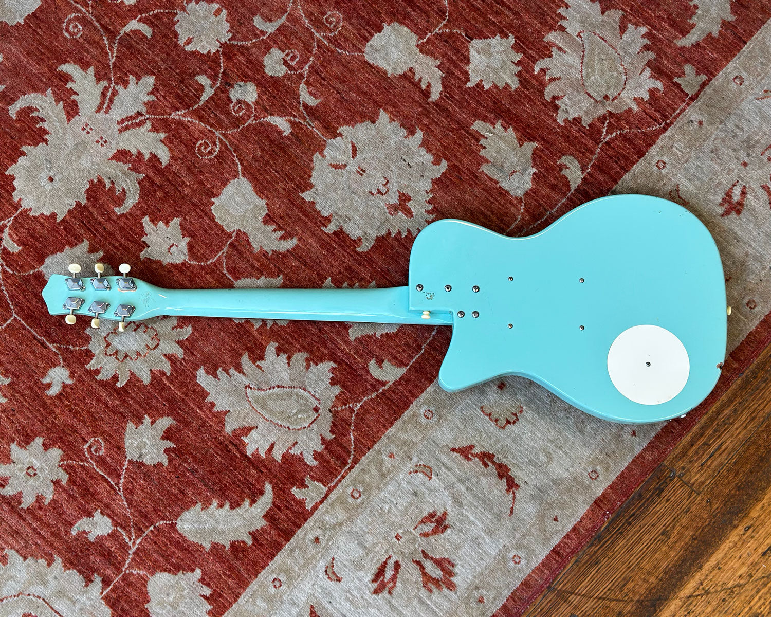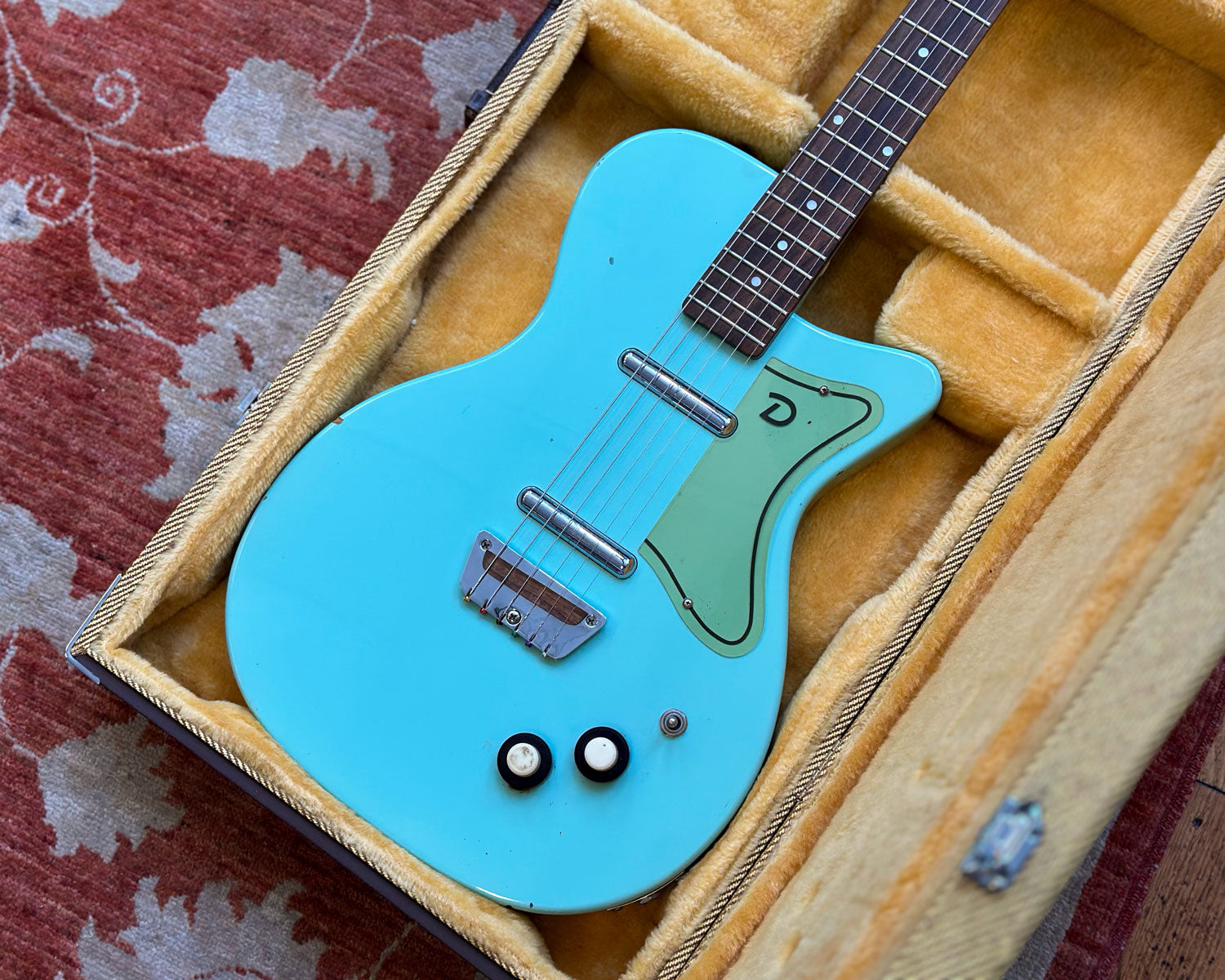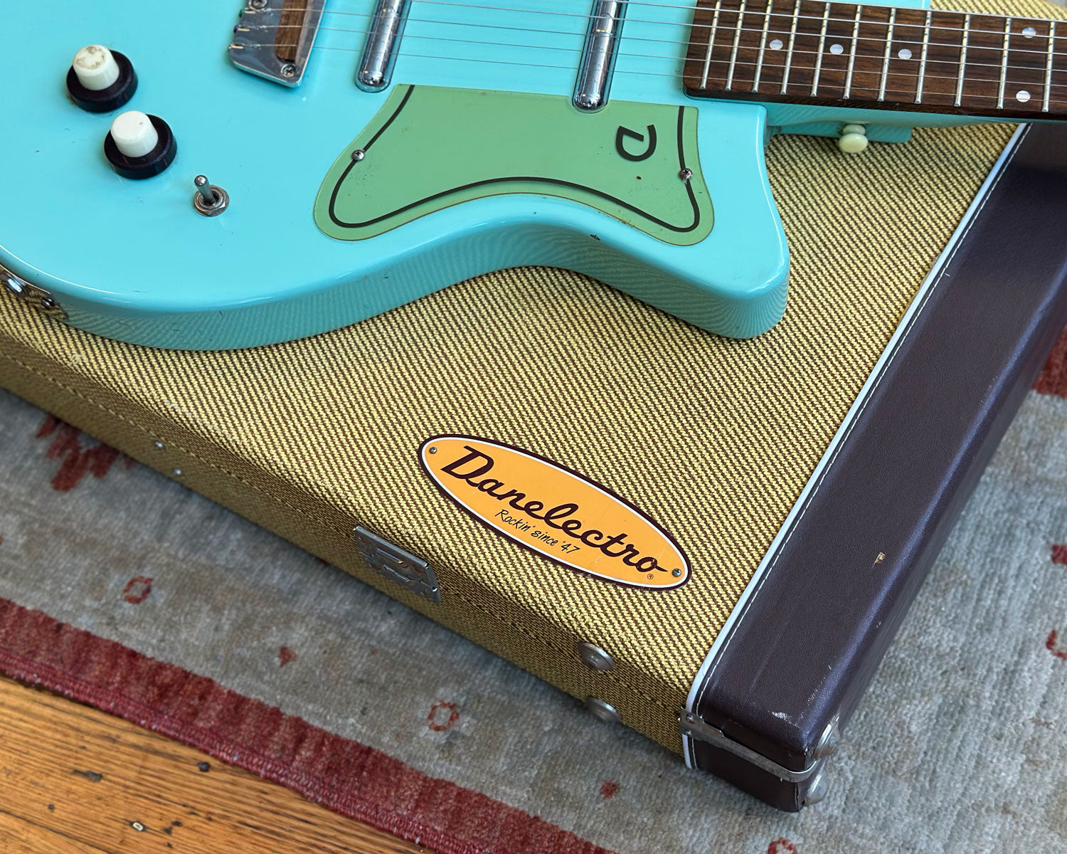 Has some blemishes and a few significant dings as pictured. Includes tweed strap and tweed Danelectro hard shell case.