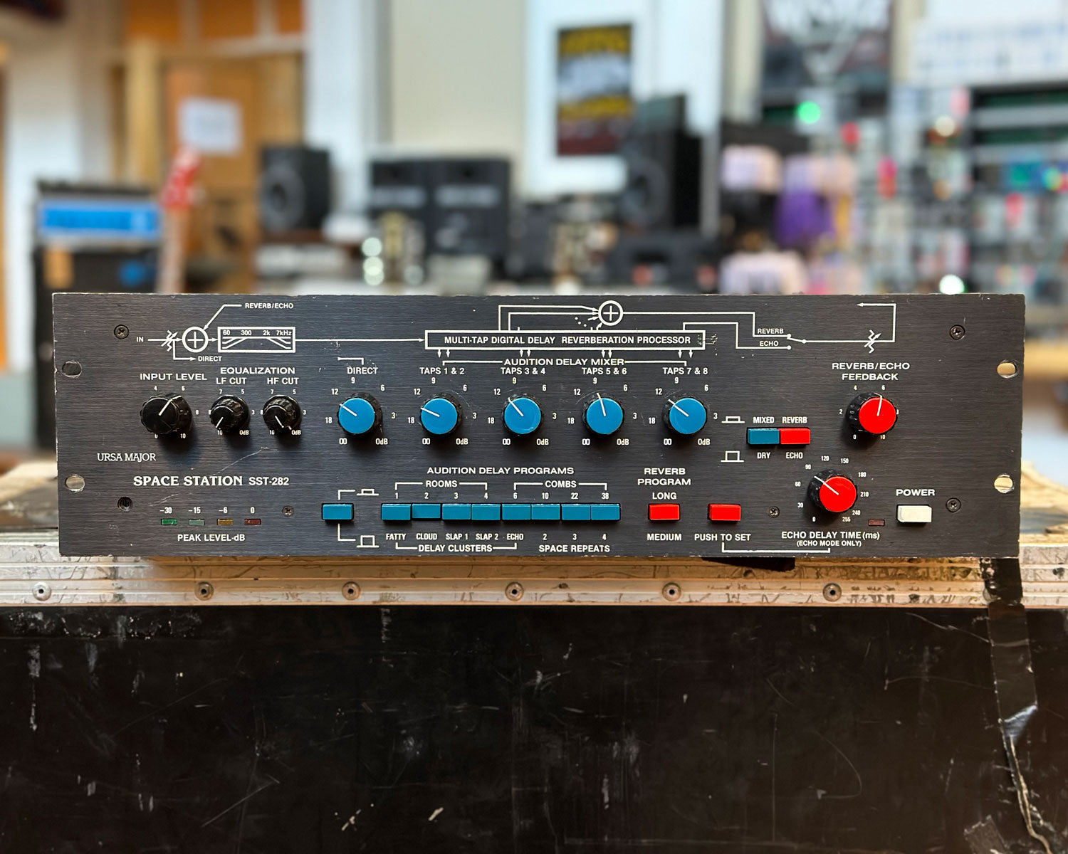One of the earliest digital studio reverbs to find its way into professional racks, the Ursa Major Space Station SST-282 is less a traditional reverb and more a beautifully strange delay laboratory. Released in the late 1970s, the Space Station uses a 255 ms digital delay memory with multiple delay taps arranged into preset patterns, creating everything from tight room reflections to comb-filtered textures and clustered echoes.