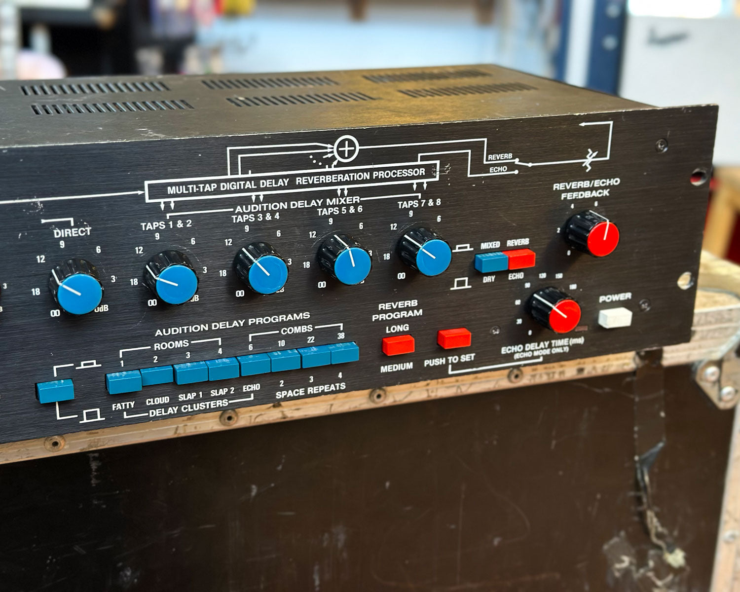 Eight “audition taps” form the stereo output image while additional internal taps generate the reverb field. Feedback, delay pattern selection, and onboard EQ shape the density and decay, allowing the unit to move from short ambience and slapback to swirling, synthetic reverbs that became a signature sound of early digital processing.