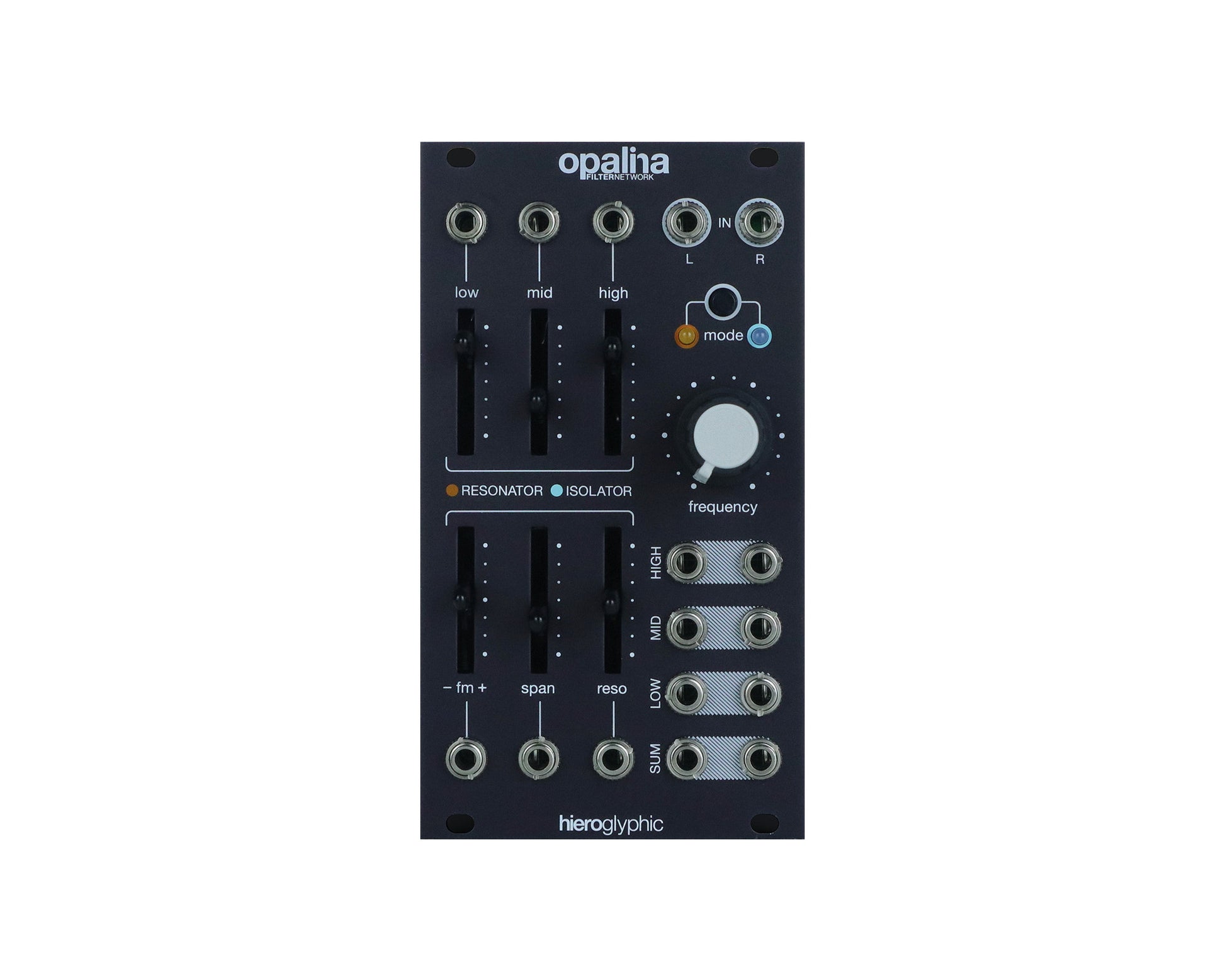 The Hieroglyphic Opalina is a dual-channel stereo state-variable filter network offering two distinct operating modes for spectral shaping and crossover duties. Resonator mode configures three band-pass filters to emphasise formants and resonant peaks, while Isolator mode uses a cascaded topology with variable mid-bandwidth for resonant crossover applications.