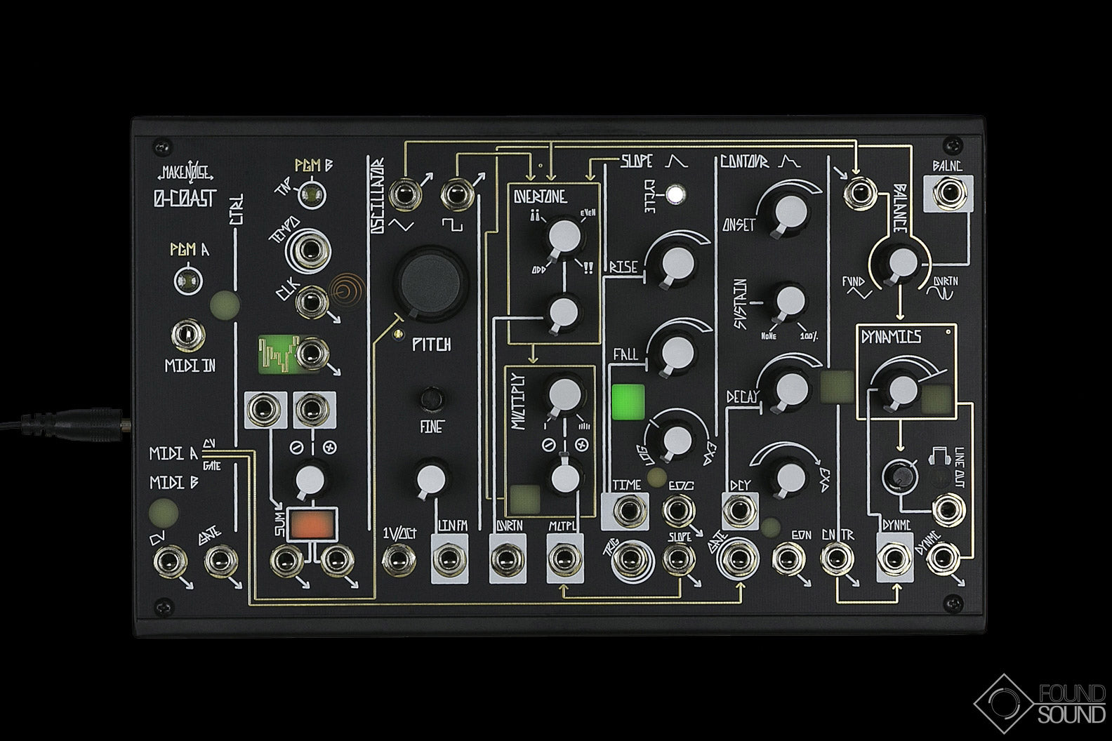 The 0-COAST is a single voice stand-alone patchable synthesiser. Its name reflects the fact that this desktop synth utilises techniques from both the Moog and Buchla paradigms (aka “East Coast,” and “West Coast,” due to their locations), but is loyal to neither and thus implements “no coast synthesis.”While the 0-COAST utilises classic modular synthesis techniques, it is designed it to operate with or without the use of patch cables, and of itself is a complete system. The necessary connections have been made from circuit to circuit so it operates as an expressive, musical MonoSynth. Using only the MIDI controller of your choice you could apply new timbres to your existing musical forms.
